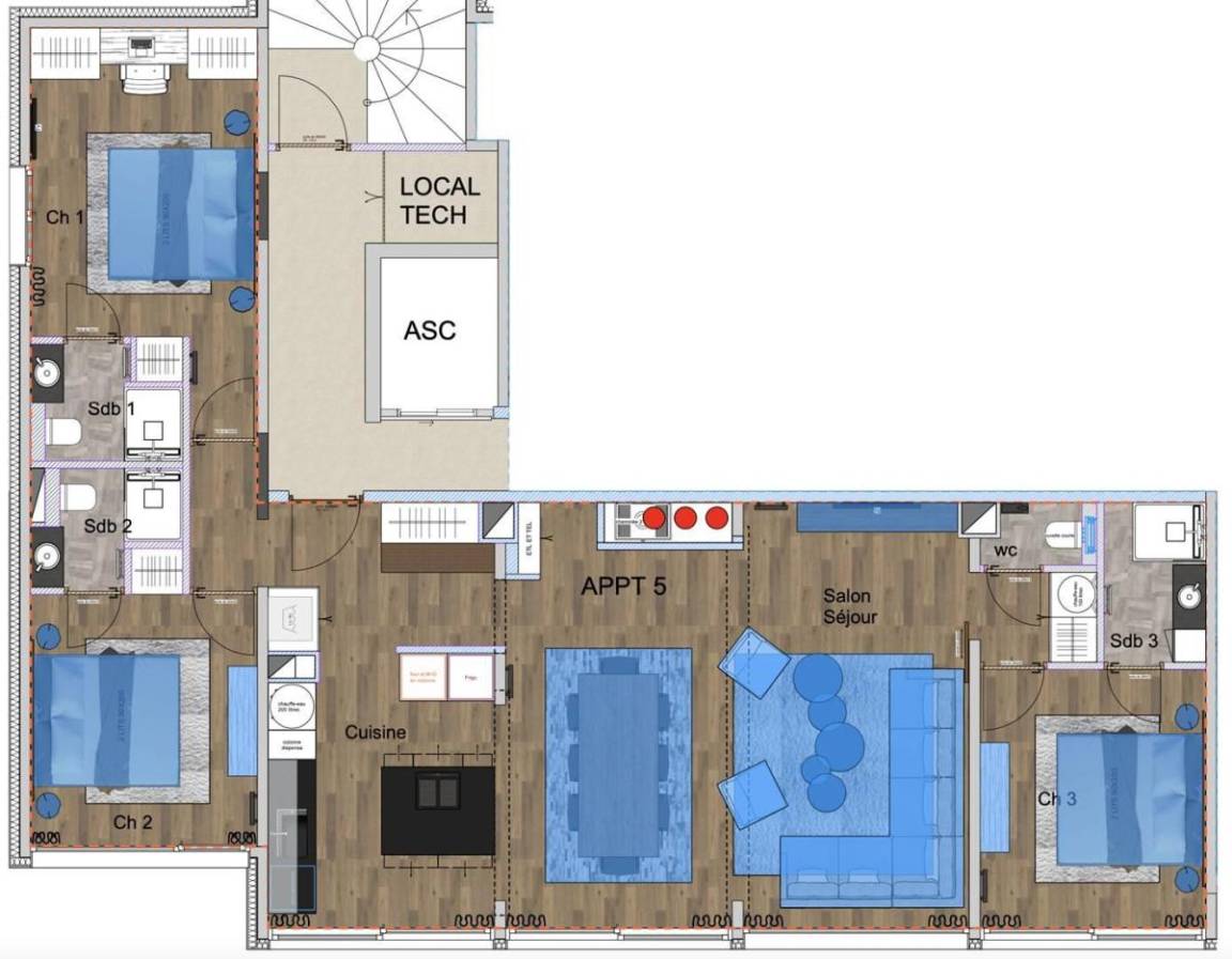 Fläche von ungefähr 105 m². 3te Etage. Orientierung : Süd. Wohnzimmer mit Sofa. Schlafzimmer mit Büro, 2 zwei Einzelbetten (2x80x200), Waschraum, WC. Schlafzimmer mit Doppelbett (160x120), Waschraum, WC. Schlafzimmer mit Doppelbett (160x120), Waschraum. offene Küche mit Wasserkocher, Kaffeemaschine, Backofen, Geschirrspülmaschine, Mikrowellenherd, Herdplatten, Kühl-Gefrier-Kombination, Wäschetrockner. separates WC. Terrasse mit Gartentisch und -stühle.