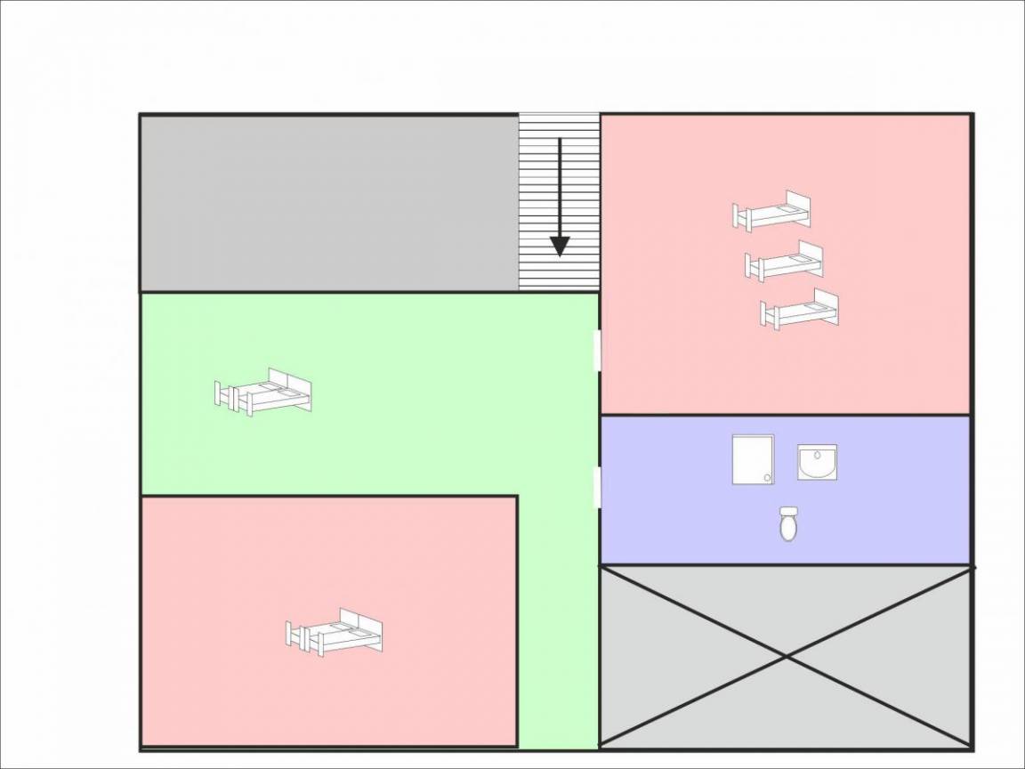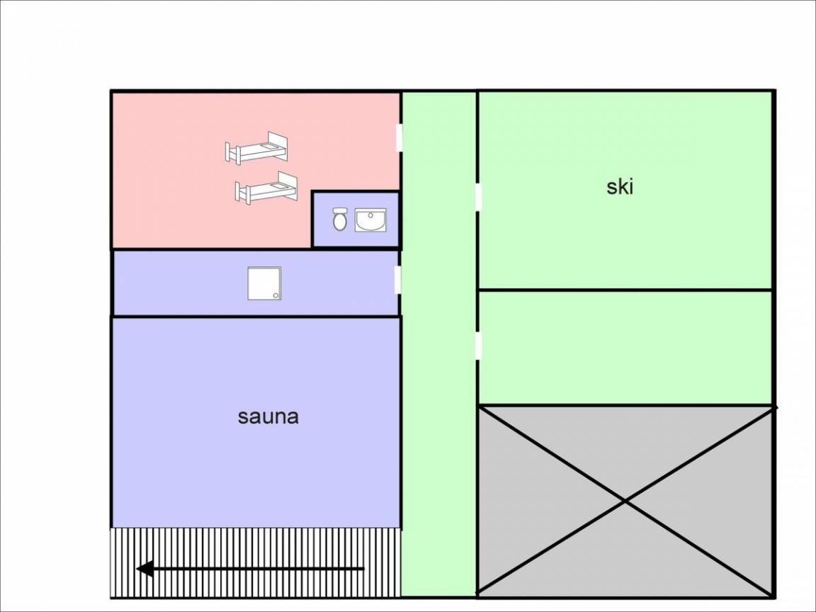 Fläche von ungefähr 170 m². Niveau 0 : Diele. Schlafzimmer mit 2 Einzelbetten. Waschräume mit Dusche, Waschbecken. separates WC. Waschmaschine. Sauna. Niveau 1 : Wohnzimmer mit Sofa, Kamin. Schlafzimmer mit 3 Einzelbetten. Schlafzimmer mit Doppelbett. Zwischengeschoss mit Klappschlafcouch. Küche mit Fonduegerät, Raclettegerät, Wasserkocher, Kaffeemaschine, Backofen, Toaster, Geschirrspülmaschine, Mikrowellenherd, Gasherdplatten, elektronische Herdplatten, Kühl-Gefrier-Kombination. separates WC. Waschräume mit Dusche, Waschbecken. Balkon. Niveau 2 : Schlafzimmer mit 3 Einzelbetten. Schlafzimmer mit Doppelbett. Waschräume mit Dusche, Waschbecken, Haartrockner, WC.