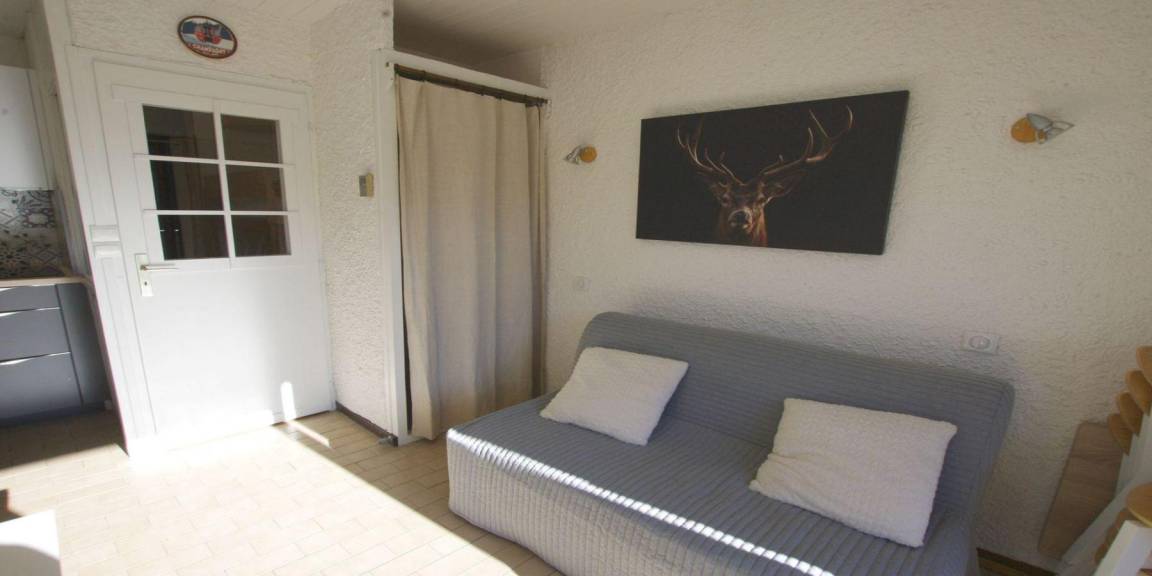 Fläche von ungefähr 20 m². 1te Etage. Orientierung : Süd. Wohnzimmer mit Klappschlafcouch (140x190). offener Schlafbereich mit 2 Stockbetten. Kochnische mit Wasserkocher, Kaffeemaschine, Backofen, Toaster, Geschirrspülmaschine, Mikrowellenherd, 2 Induktionsherdplatten, Kühl-Gefrier-Kombination. Badezimmer mit Dusche. separates WC. Balkon. Die oberen Betten sind nicht für Kinder unter 6 Jahren geeignet.