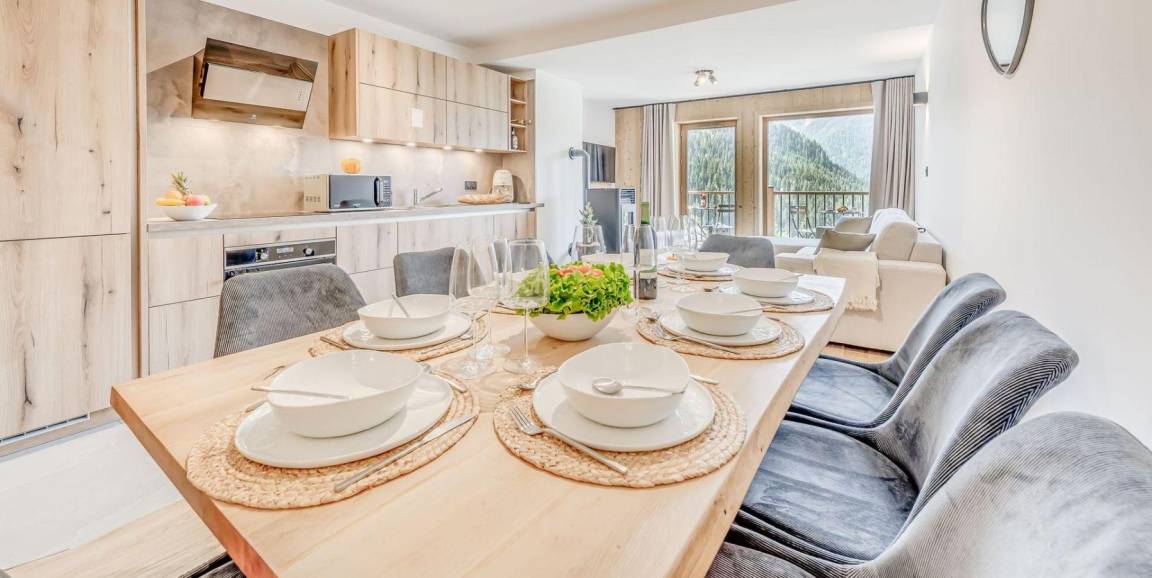 Fläche von ungefähr 82 m². 1te Etage. Orientierung : Ost, Süd. Wohnzimmer mit Klappschlafcouch, Sessel, . Schlafzimmer mit Doppelbett (140x190). Schlafzimmer mit 2 Einzelbetten (90x100). Schlafzimmer mit Dusche, Doppelbett (140x190). Kochnische mit Backofen, Geschirrspülmaschine, Mikrowellenherd, 2 Induktionsherdplatten, Kühl-Gefrier-Kombination. Badezimmer mit Waschmaschine, Wäschetrockner. separates WC. Balkon ab 4.10 m². Balkon ab 4.65 m².