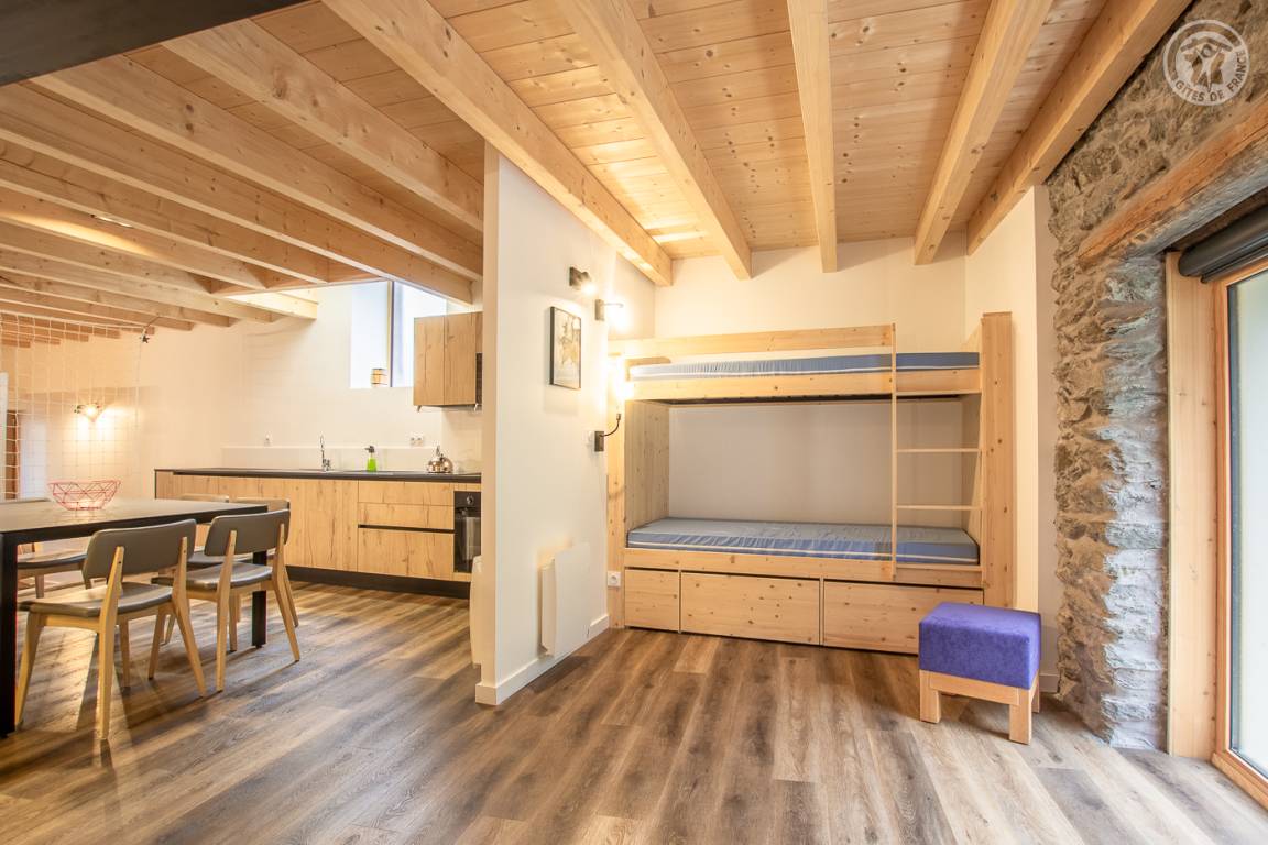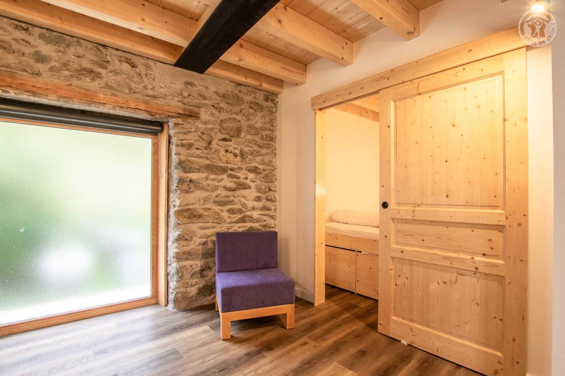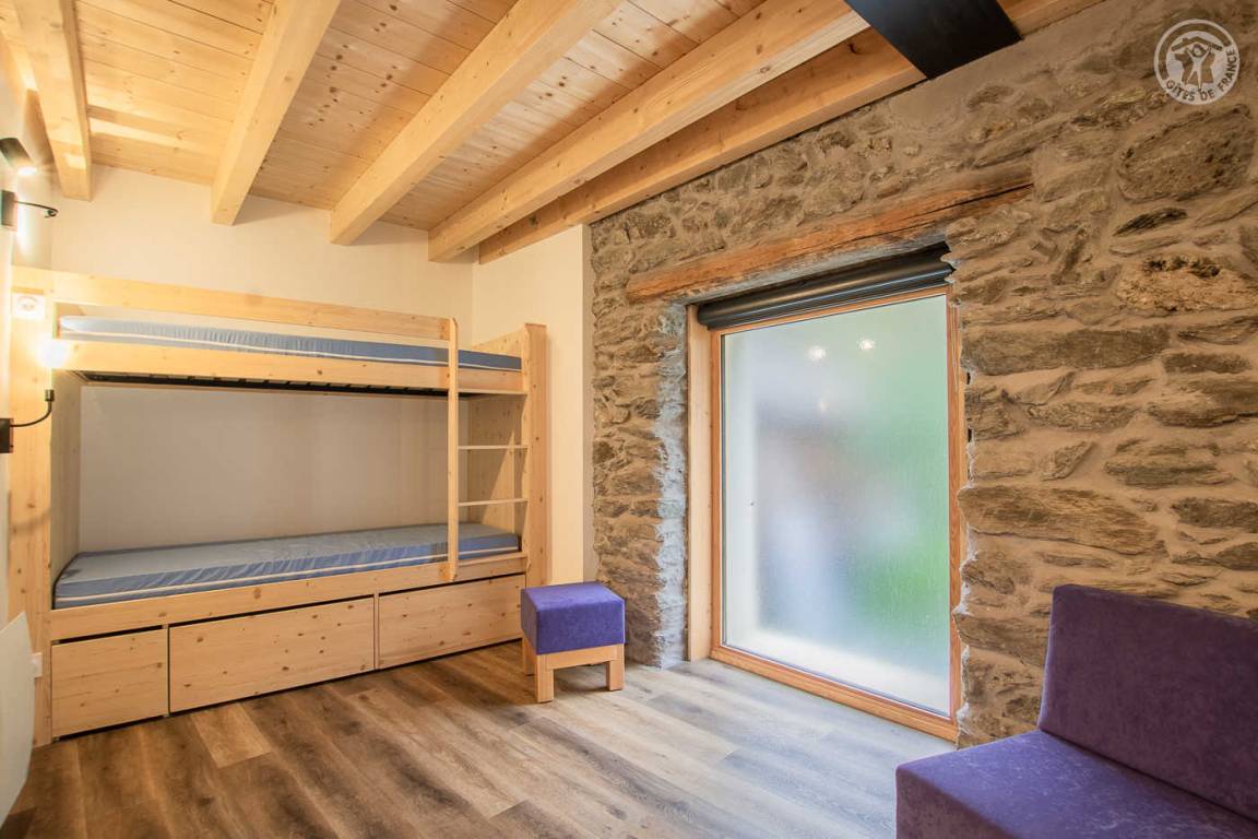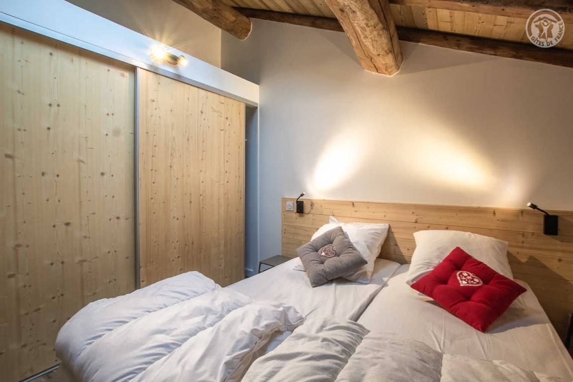 Maisonette-Ferienhaus in einem Dorfhaus, bestehend aus im 1. Stock: einem Eingang, einem Wohnbereich, einer Wohnküche mit Zugang zu einem Familienschlafzimmer mit 2 Etagenbetten (80 x 200 cm) und einem umschlossenen Savoyard-Bett (1 Doppelbett). in einer Nische, die durch eine Schiebetür verschlossen ist). 2. Etage: 2 Schlafzimmer mit jeweils 2 Einzelbetten 80 x 200 cm, die zu 1 Doppelbett 160 x 200 cm kombiniert werden können, ein großes Zwischengeschoss mit Sitzecke, ein Badezimmer (Badewanne mit Duschstange), separates WC. Balkon. Öffentlicher Parkplatz vor dem Ferienhaus oder am Ortseingang. Die Vermietung von Bettwäsche umfasst auch die Vermietung von Badezimmerwäsche.