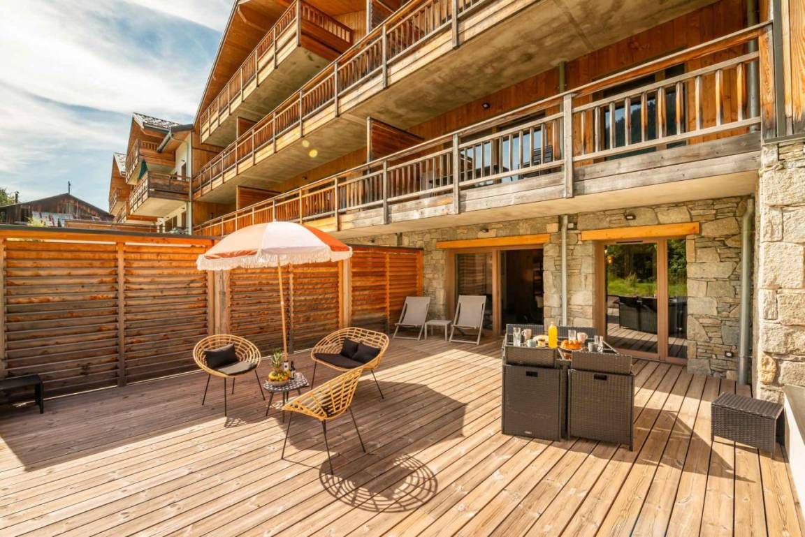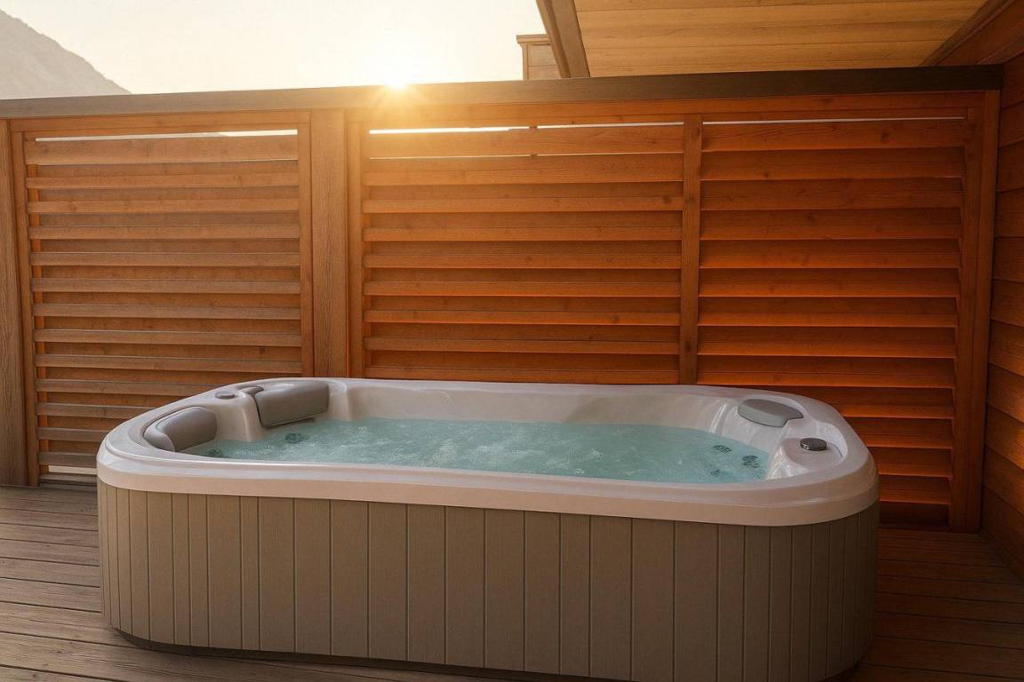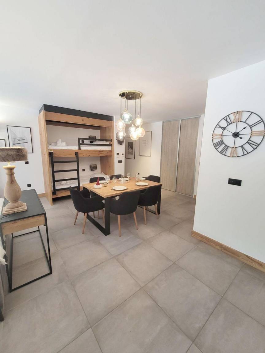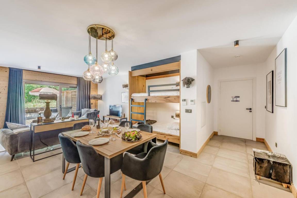 Fläche von ungefähr 67 m². Erdgeschoss. Orientierung : Nord, Süd. Diele. Wohnzimmer mit Klappschlafcouch. Schlafzimmer mit Doppelbett (160*200), Waschraum, TV. offener Schlafbereich mit 2 Stockbetten (90*200). Küche mit Multifunktions-Backofen, Geschirrspülmaschine, 2 Induktionsherdplatten, Kühl-Gefrier-Kombination. Badezimmer. WC. Terrasse mit Whirlpool, Gartentisch und -stühle. Die oberen Betten sind nicht für Kinder unter 6 Jahren geeignet.