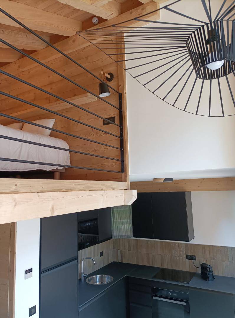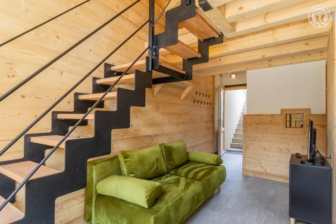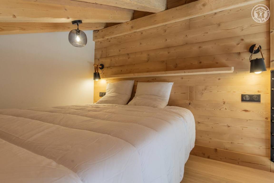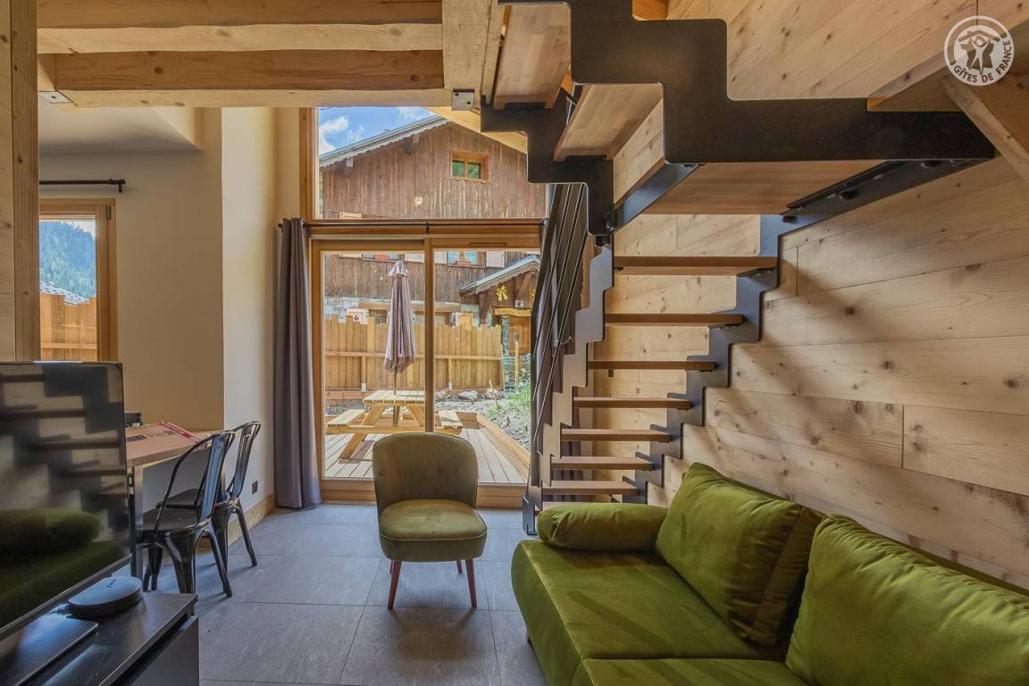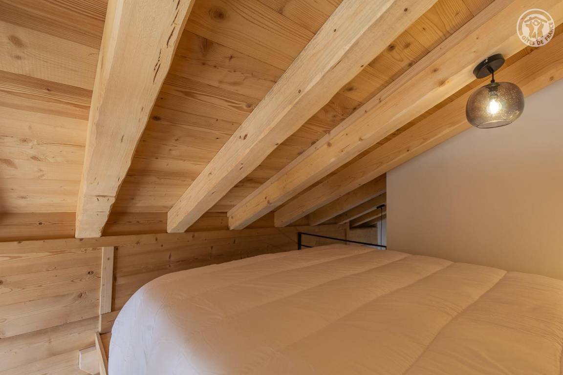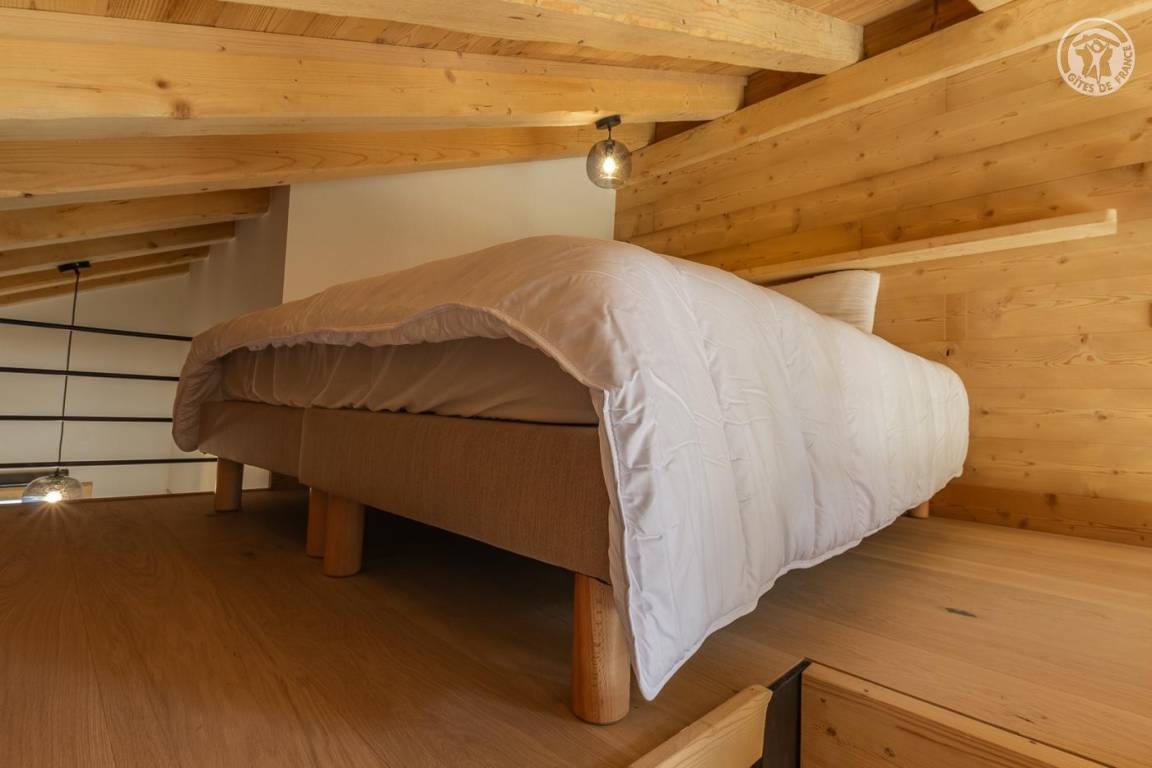 Chalet am Hang, inklusive einer zweiten Gîte. Unabhängiger Zugang über eine absteigende Außentreppe. Auf der 1. Ebene: 1 Schlafzimmer (2 Etagenbetten 90 x 200 cm) mit Schreibtisch und Zugang zum Wellnessbereich, der mit der anderen Unterkunft geteilt wird, einschließlich einer Sauna und einem Whirlpool (private Plätze, siehe Bedingungen mit dem Eigentümer). Ein Badezimmer mit WC (Dusche). Wohnzimmer mit TV und WLAN-Anschluss, Esszimmer und Küche mit Zugang zu einer kleinen Terrasse. Schlafzimmer im Zwischengeschoss (1 Doppelbett 160 x 200 cm) mit Sicherheitsbarriere. Ein privater Parkplatz vor dem Chalet.