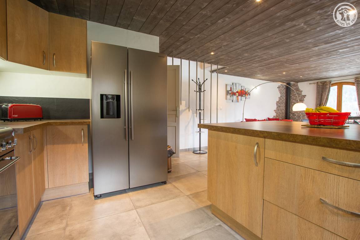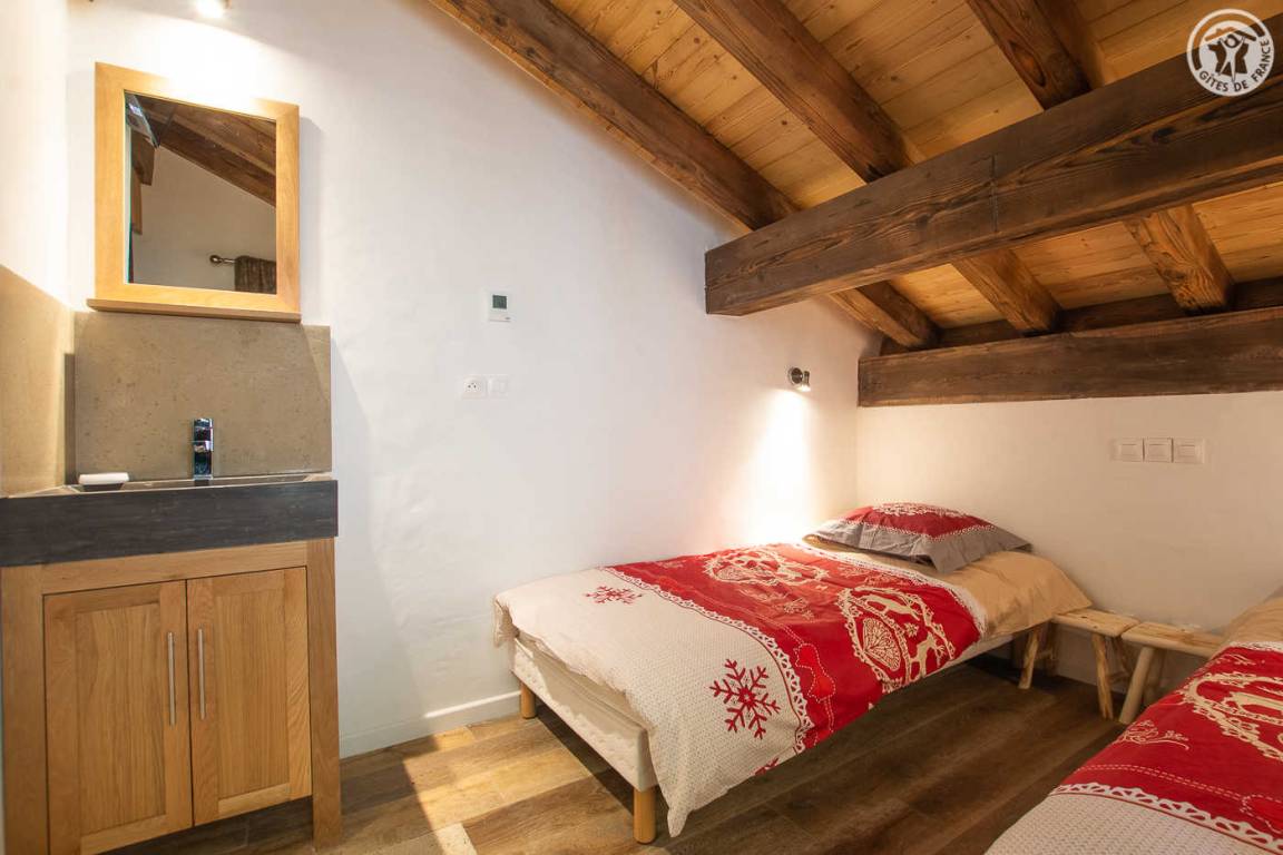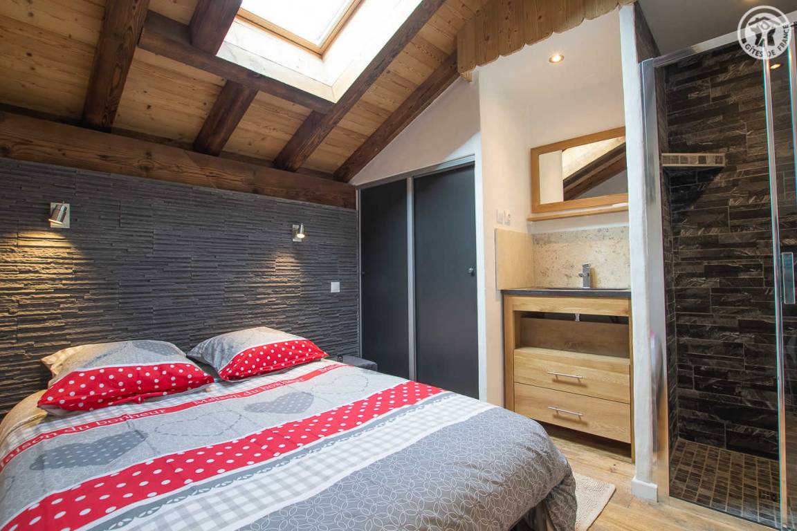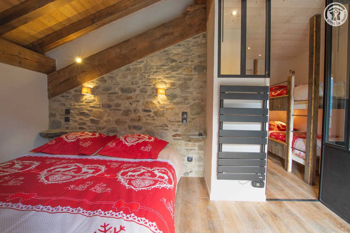 Chalet neben einem Hauptwohnsitz. Auf 3 Ebenen: Eingang durch die große Garage, Ruhebereich (mit TV), Wellnessbereich (mit 4-Sitzer-Sauna, Dusche, Badewanne), Waschküche (Waschmaschine und Trockner). Im 1. Stock: Wohnzimmer-Küche-Wohnzimmer mit großer 40 m² möblierter Balkon-Terrasse, WC. Im 2. Stock: 1 Schlafzimmer mit Balkon und Dusche (1 Doppelbett 160x200 cm und Schlafbereich mit 2 Etagenbetten), 2 Schlafzimmer mit Dusche, Waschbecken und TV (2 Etagenbetten / 1 Doppelbett 140x190 cm), WC . Garage zum Abstellen mehrerer Fahrzeuge, zum Abstellen von Fahrrädern, Motorrädern und Skiern.