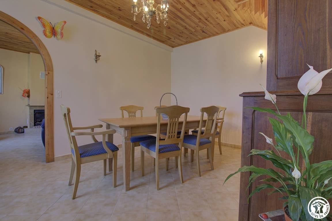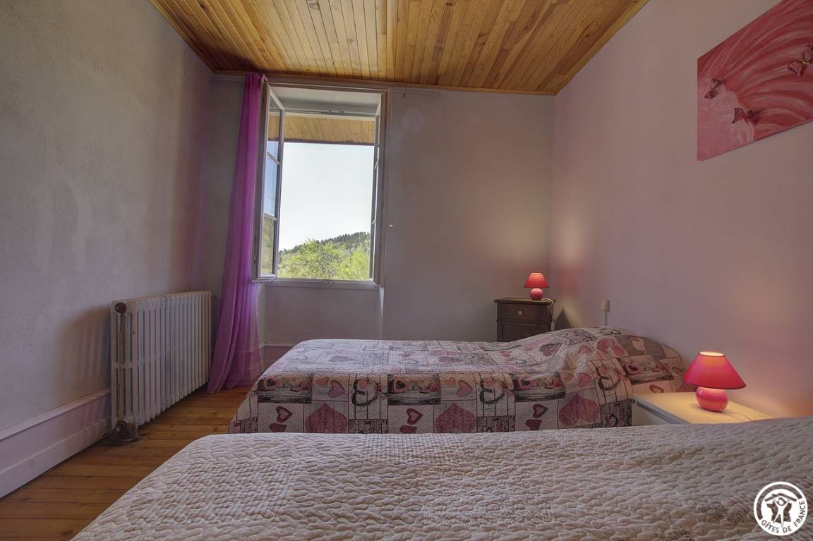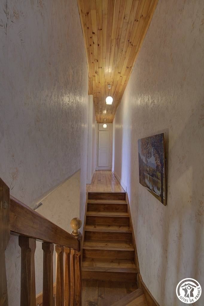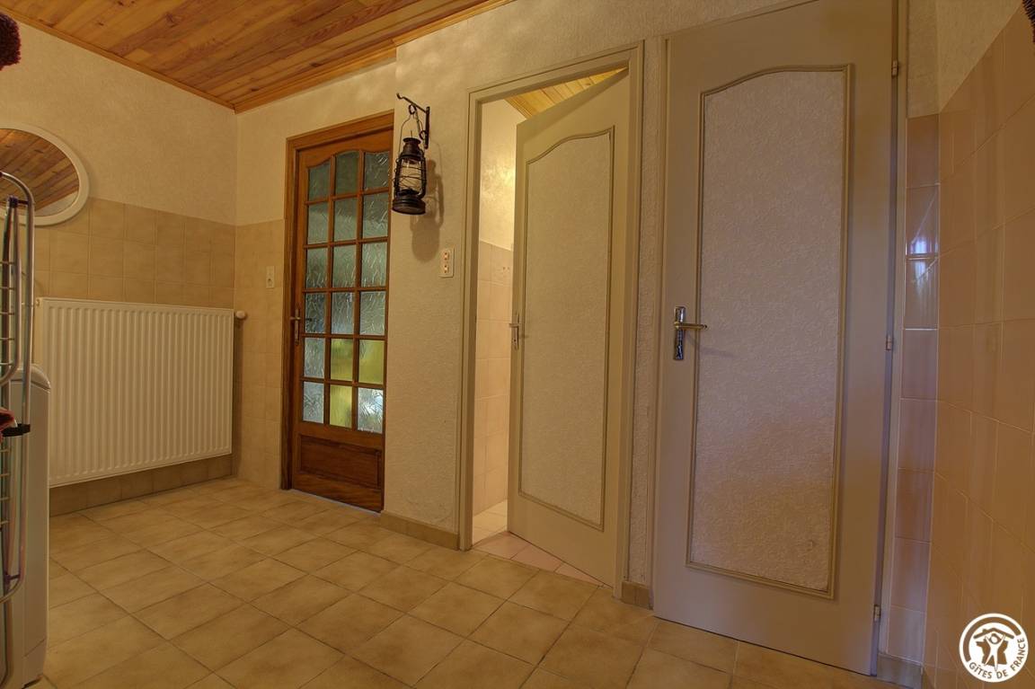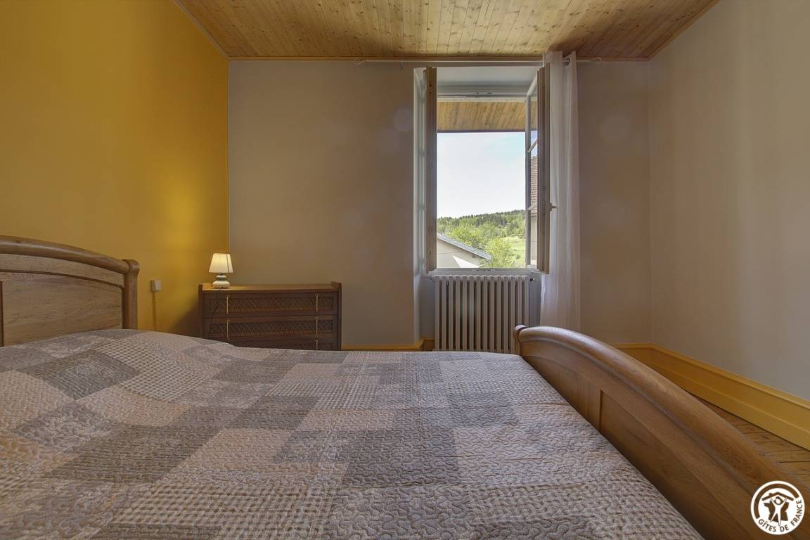 Auf 780 Metern Höhe, 4 km vom Genin-See (siehe Foto), auch bekannt als „Klein-Kanada des Haut Bugey", liegt das Ferienhaus La Vigne (116 m²) in einem ruhigen Weiler. Es bietet Platz für 6 Personen in seinen 4 Schlafzimmern im Obergeschoss, die über eine Treppe erreichbar sind. Der Haupteingang befindet sich zwischen dem kleinen Garten und der Terrasse und grenzt direkt an das Haupthaus der Eigentümer. Rechts vom Flur liegt eine separate, funktionale Küche. Links befindet sich ein Wohnzimmer mit Zugang zu einem Aufenthaltsraum mit Kamin. Am anderen Ende des Flurs befindet sich ein offener Hauswirtschaftsraum mit Spüle und Waschmaschine, neben dem Badezimmer und einem separaten WC. Eine schöne Holztreppe führt zu den 4 Schlafzimmern: dem orangefarbenen Zimmer mit einem Doppelbett (160 x 200 cm), dem Kinderzimmer mit Ausziehbett, Spielecke und eigenem Balkon, dem blauen Zimmer mit zwei Einzelbetten (90 x 200 cm) und dem rosafarbenen Zimmer mit zwei Einzelbetten (90 x 200 cm). Die Zentralh