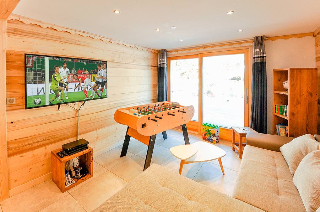 Parterre: Aufenthaltsraum mit Sitzmöglichkeit, Spielecke (Kicker, Spielekonsole). Doppelzimmer mit franz. Bett. 4-Bettzimmer mit 2 Etagenbetten. Bad: Bw/Du, Wb. Separates WC. Kleiner Wellnessbereich mit Sauna, Dusche.