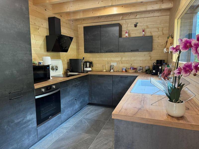 Fläche von ungefähr 100 m². Erdgeschoss. Orientierung : Süd. Wohnzimmer. 2 Schlafzimmer mit Doppelbett (160*200). Schlafzimmer mit Doppelbett, Doppel Hochbett. Küche mit Raclettegerät, Wasserkocher, 2 Kaffeemaschinen (filtres et Nespresso), Backofen, Toaster, Geschirrspülmaschine, Mikrowellenherd, 2 Induktionsherdplatten, Kühl-Gefrier-Kombination. 2 Badezimmer mit WC. Terrasse mit Gartentisch und -stühle. Waschmaschine, Wäschetrockner.
