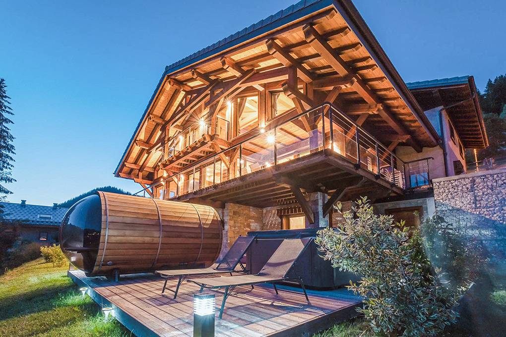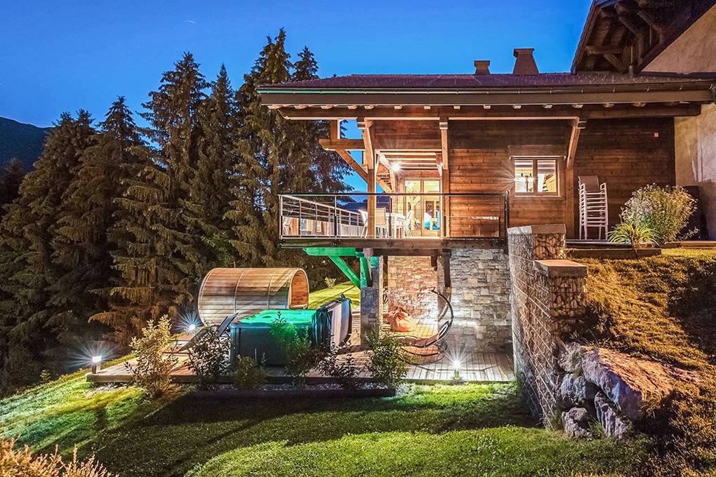 Haus: Modernes Luxus-Chalet mit Sauna und Whirlpool. Großzügiges 8-Zimmerhaus mit 270 qm Wohnfläche über drei Etagen. 2 Aufenthaltsräume, 6 Schlafräume, 5 Bäder! Sehr geschmackvolle Einrichtung, gemütliches Chalet-Ambiente durch schöne Holzvertäfelung. Moderne Komfortausstattung: Internetzugang über W-Lan, Pellet-Kaminofen, alle Bäder mit Haar-Fön, Handtuchwärmer. In den Doppelzimmern stets Einzelbetten, die auch als Doppelbett kombiniert werden können. Waschmaschine, Trockner, Schuhtrockner. Zentral-/Fußbodenheizung. Großer überdachter Balkon mit Sitzmöbeln, schönem Bergblick. Außenwhirlpool, moderne Fasssauna mit Panoramafenster, herrlichem Blick. 5-6 Pkw-Stellplätze am Haus.