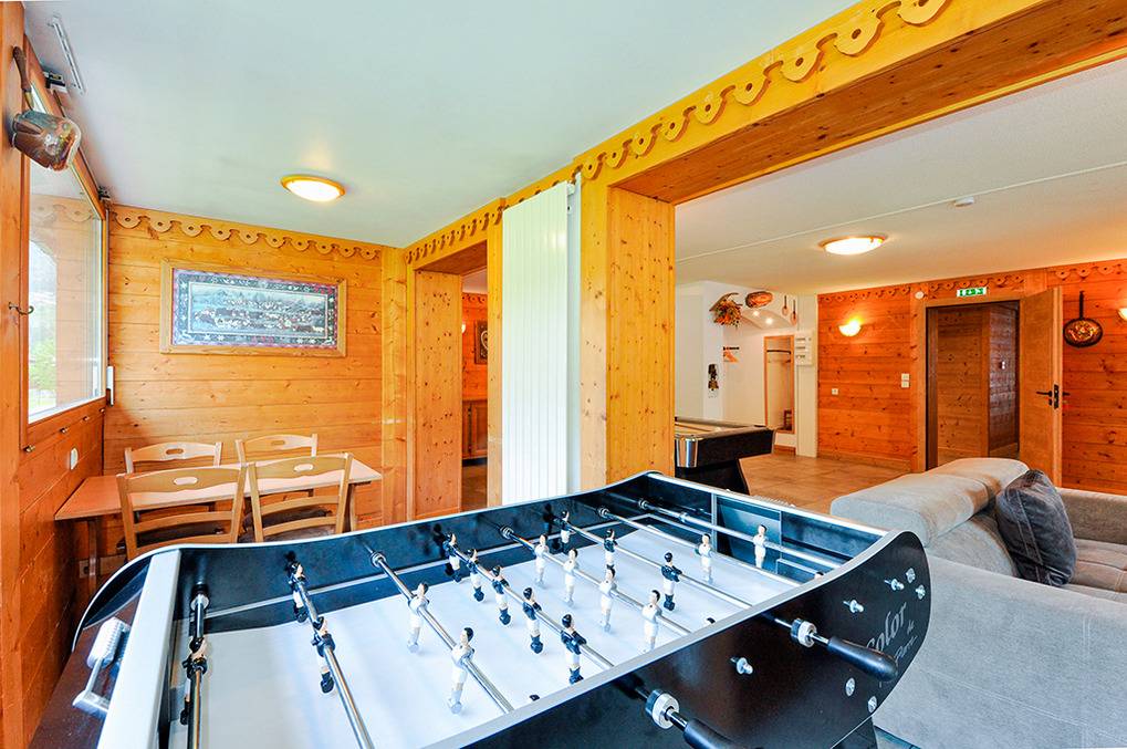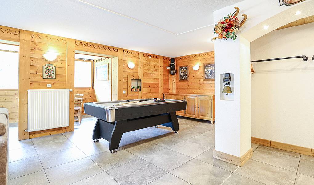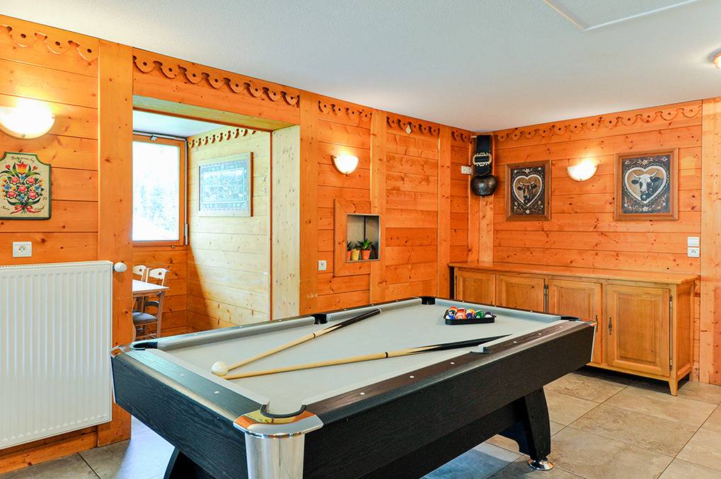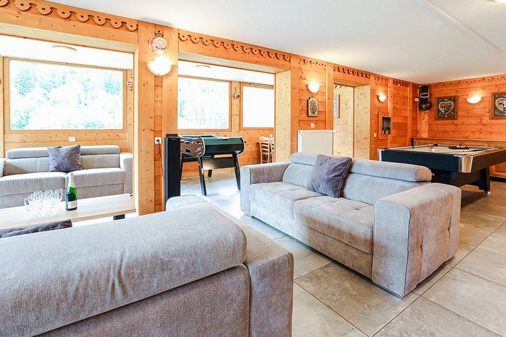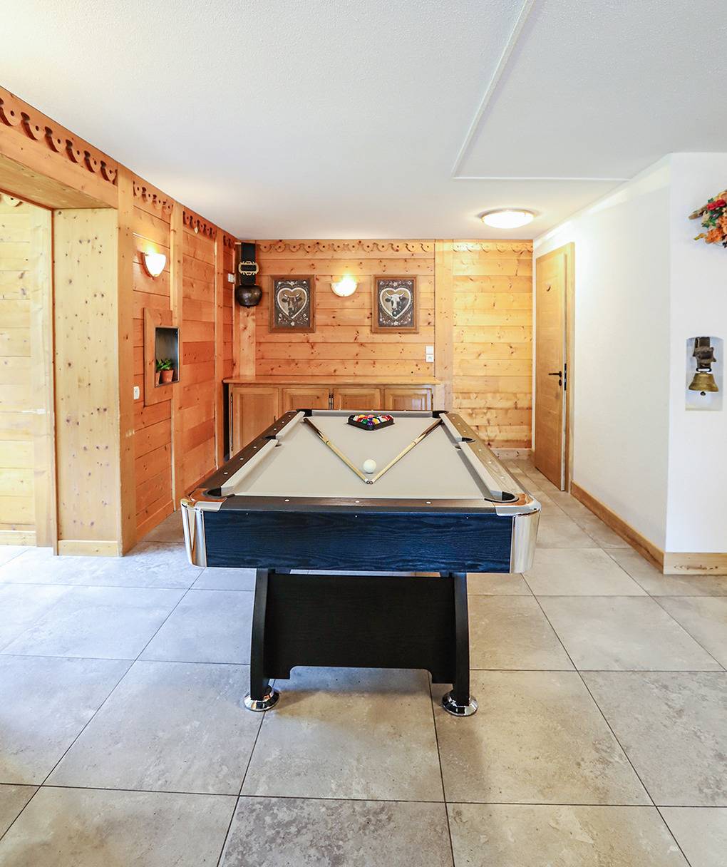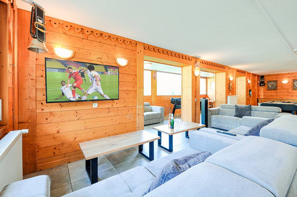 F 016.035 Chaletwohnung 10-15 Pers.: 8-Zimmerwohnung mit 300 qm Wohnfläche über zwei Etagen. Parterre: Großzügiger Wohnraum (100 qm) mit Sitzecke, Smart/Sat-TV, Billard, Kicker, Esstischen, Lounge-Ecke mit schönem Blick auf die Berge, gut ausgestatteter Küche (Backofen, Mikrowelle, Spülmaschine, Tiefkühlschrank). Separates WC. Vom Wohnraum aus Treppe in die 1. Etage: Doppelzimmer mit franz. Bett, Bad, Balkon. Vier Doppelzimmer mit Bad, Balkon. 3-Bettzimmer mit Bad, Balkon. 4-Bettzimmer mit 2 Einzelbetten, Etagenbett, Bad, Balkon. Tiefparterre: eigener Wellnessbereich mit Sauna, Whirlpool, Dusche, WC, Ruheliegen, Panoramafenstern auf die Bergwelt von Châtel.