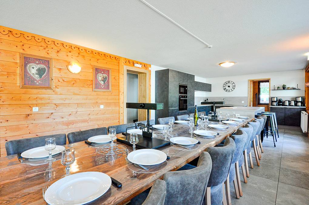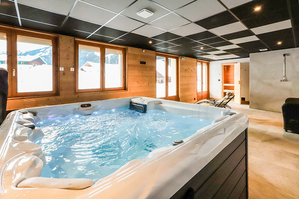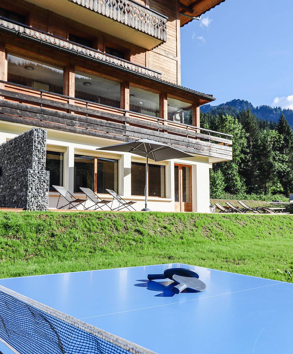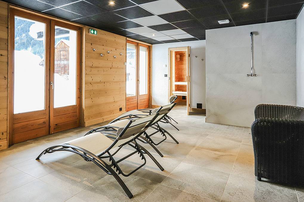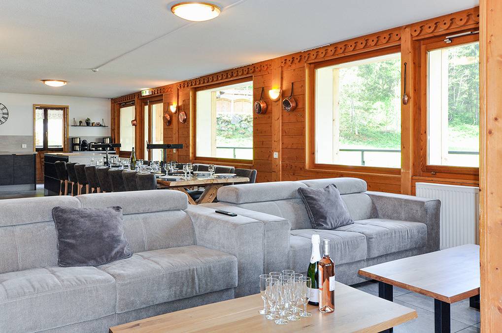 F 016.035 Chaletwohnung 10-15 Pers.: 8-Zimmerwohnung mit 300 qm Wohnfläche über zwei Etagen. Parterre: Großzügiger Wohnraum (100 qm) mit Sitzecke, Smart/Sat-TV, Billard, Kicker, Esstischen, Lounge-Ecke mit schönem Blick auf die Berge, gut ausgestatteter Küche (Backofen, Mikrowelle, Spülmaschine, Tiefkühlschrank). Separates WC. Vom Wohnraum aus Treppe in die 1. Etage: Doppelzimmer mit franz. Bett, Bad, Balkon. Vier Doppelzimmer mit Bad, Balkon. 3-Bettzimmer mit Bad, Balkon. 4-Bettzimmer mit 2 Einzelbetten, Etagenbett, Bad, Balkon. Tiefparterre: eigener Wellnessbereich mit Sauna, Whirlpool, Dusche, WC, Ruheliegen, Panoramafenstern auf die Bergwelt von Châtel.
