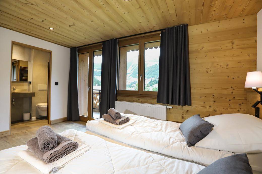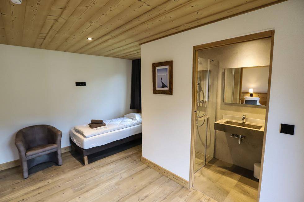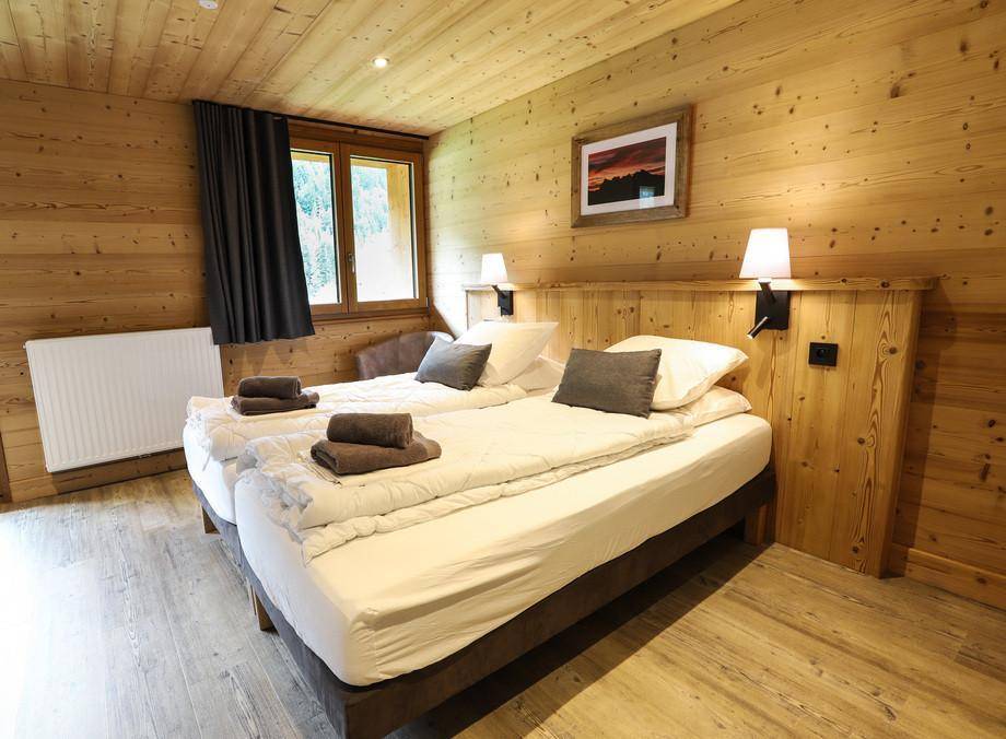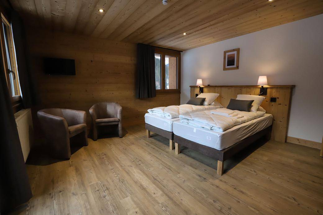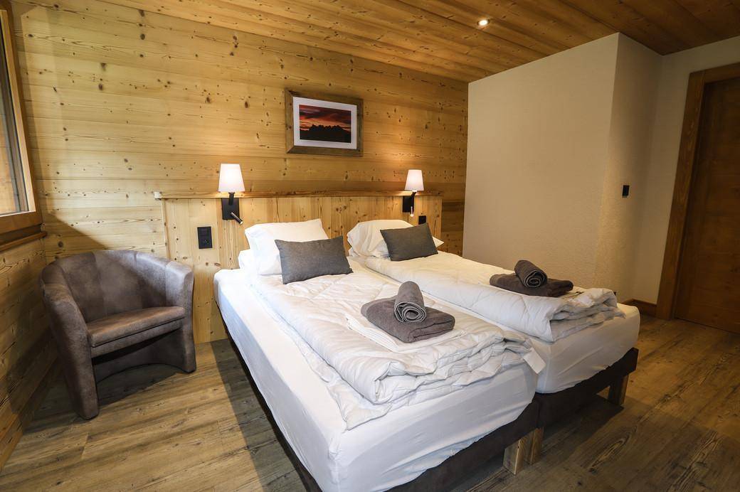 Fläche von ungefähr 300 m². Orientierung : West. Niveau 0 : Wohnzimmer. Schlafzimmer mit Doppelbett (160x200), Waschraum, WC. 4 Schlafzimmer mit Einzelbett (90x200), Waschraum, WC. Schlafzimmer mit 2 Einzelbetten (90x200), 2 Stockbetten (80x190), Waschraum, WC. Schlafzimmer mit 3 Einzelbetten (90x200), Waschraum, WC. Küche mit Fonduegerät, Raclettegerät, 2 Wasserkocher, 3 Kaffeemaschinen, Backofen, Toaster, Geschirrspülmaschine, Mikrowellenherd, 2 Induktionsherdplatten, Kühl-Gefrier-Kombination. separates WC. Badezimmer. Balkon. Niveau -1 : Waschräume. separates WC. Terrasse. Die oberen Betten sind nicht für Kinder unter 6 Jahren geeignet.