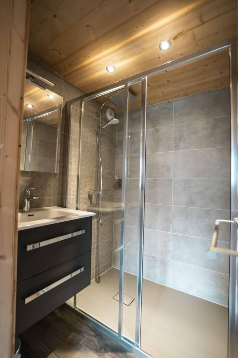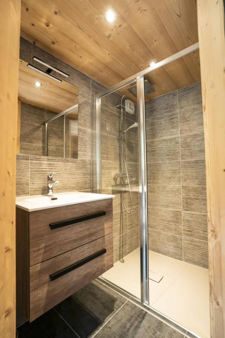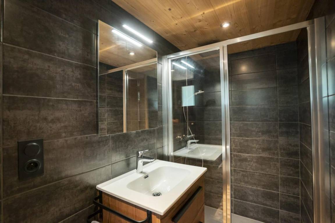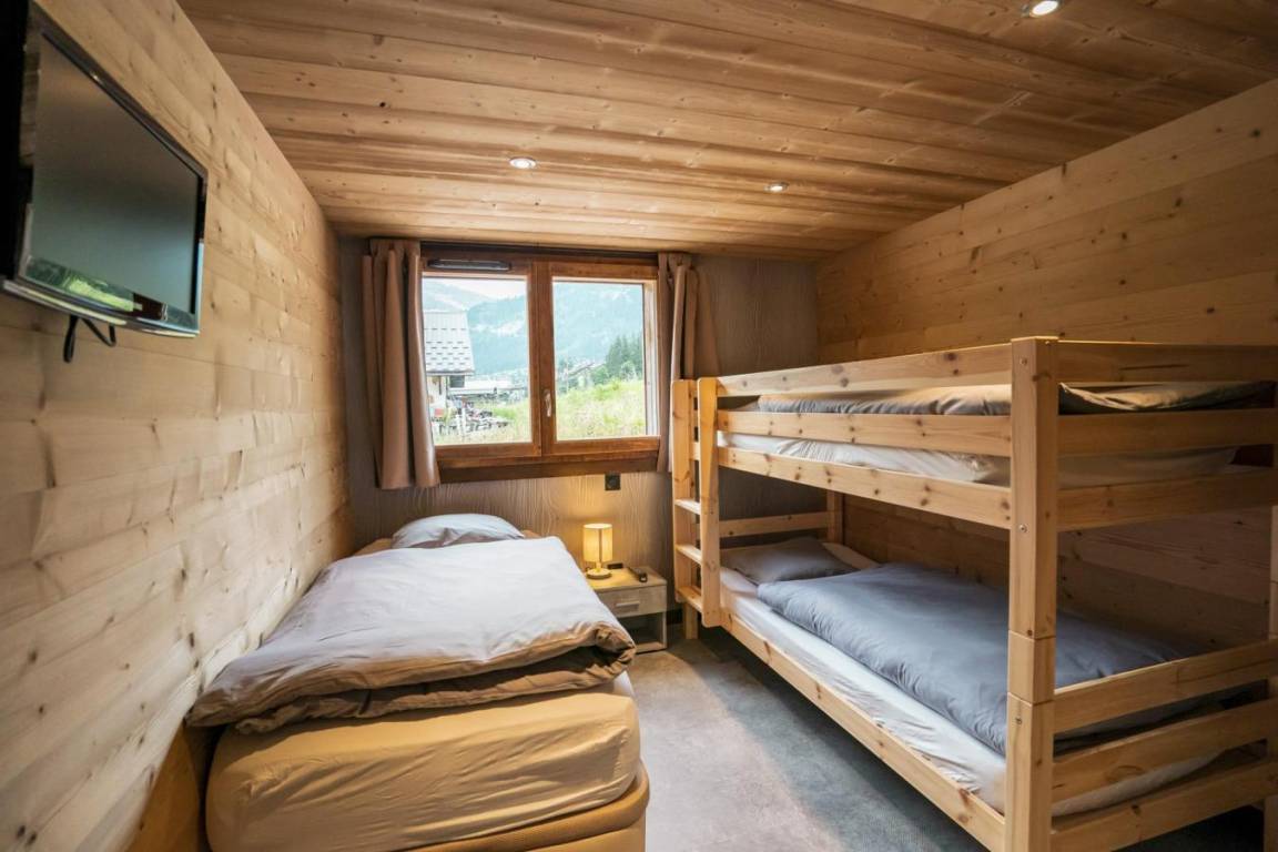 Fläche von ungefähr 75 m². Orientierung : Nord. Wohnzimmer mit Sofa. Schlafzimmer mit 2 Einzelbetten (80*200), Waschraum. Schlafzimmer mit Doppelbett (160*200), Waschraum. Schlafzimmer mit Einzelbett (90*200), 2 Stockbetten, Waschraum. Küche mit Fonduegerät, Raclettegerät, Backofen, Geschirrspülmaschine, Mikrowellenherd, 2 elektronische Herdplatten, Kühl-Gefrier-Kombination. Badezimmer. separates WC. Balkon. Die oberen Betten sind nicht für Kinder unter 6 Jahren geeignet.