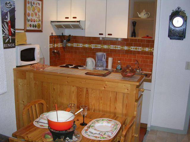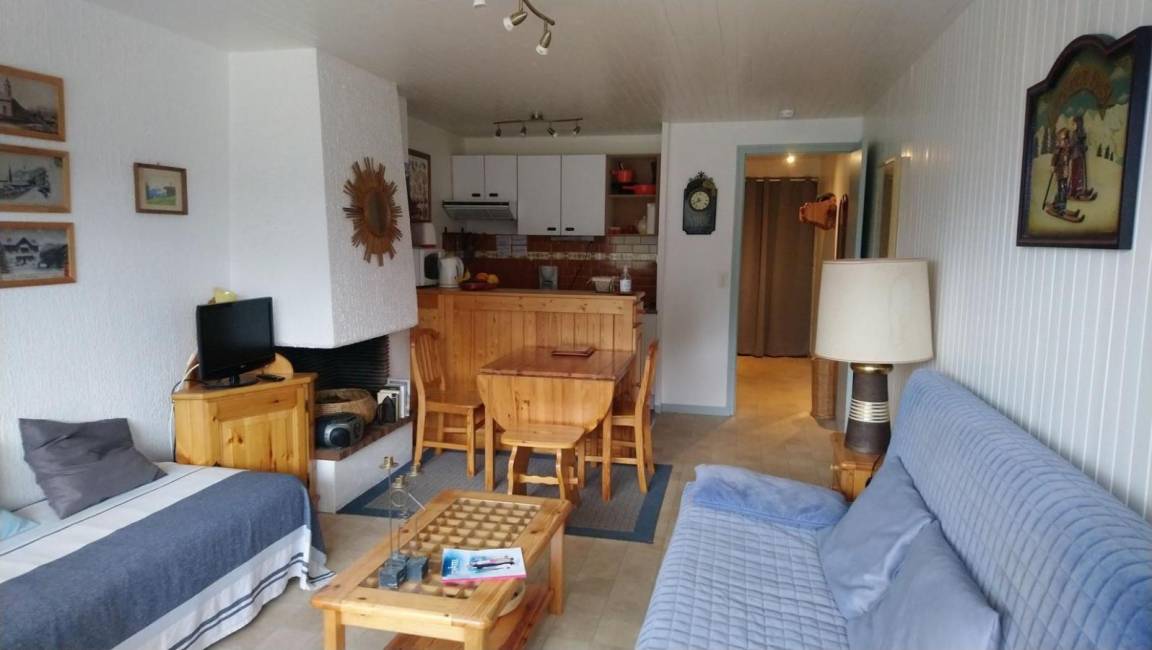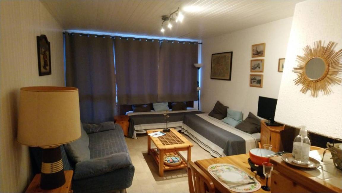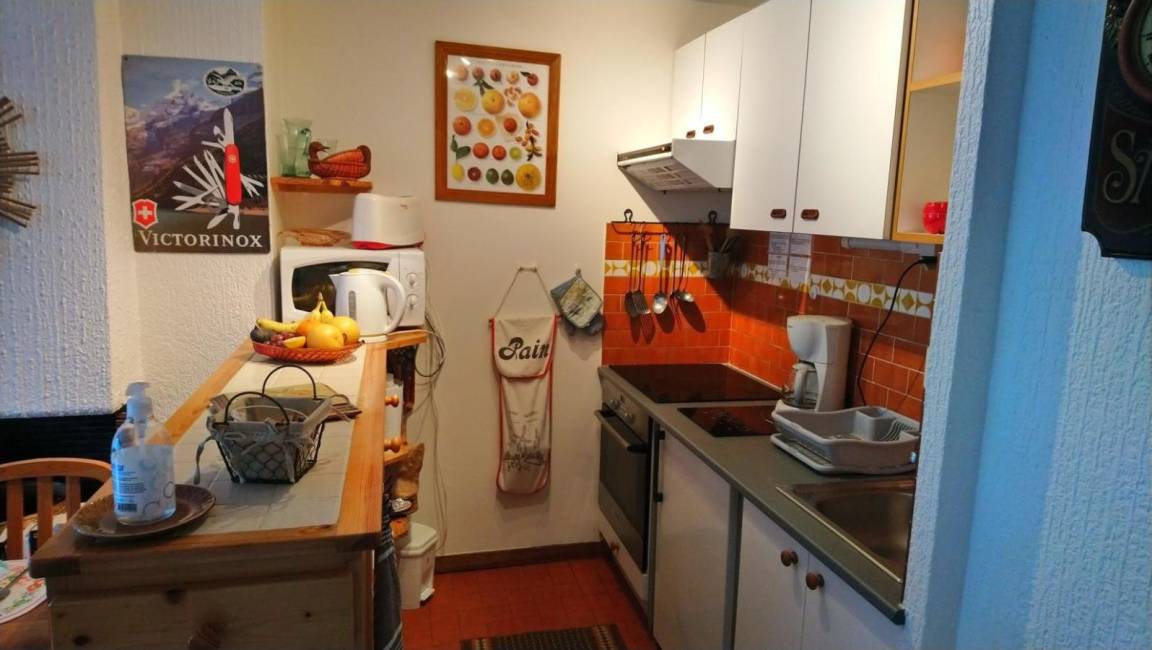 Fläche von ungefähr 30 m². 4te Etage. Orientierung : West. Wohnzimmer mit Klappschlafcouch, Einzelbett. Kochnische mit Fonduegerät, Raclettegerät, Wasserkocher, Kaffeemaschine (filtres), Backofen, Toaster, Mikrowellenherd, Glaskeramikkochfelder, Kühlschrank. Badezimmer mit Badewanne, Haartrockner, WC. Balkon.