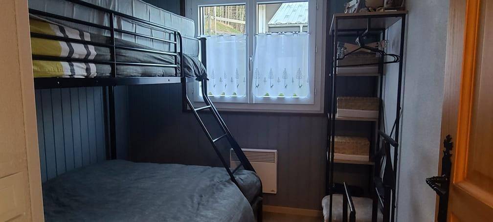 Fläche von ungefähr 40 m². 2te Etage. Orientierung : Süd-West, Nord-West. Wohnzimmer mit Klappschlafcouch (140*190), TV. Schlafzimmer mit Doppelbett, TV. Schlafzimmer mit Doppelbett (140*190), Stockbett (1 place). Küche mit Raclettegerät, Wasserkocher, Kaffeemaschine (filtre), Backofen, Toaster, Geschirrspülmaschine, Mikrowellenherd, 2 Induktionsherdplatten, Kühlschrank. Waschräume. separates WC. Balkon mit , Gartentisch und -stühle. Die oberen Betten sind nicht für Kinder unter 6 Jahren geeignet.