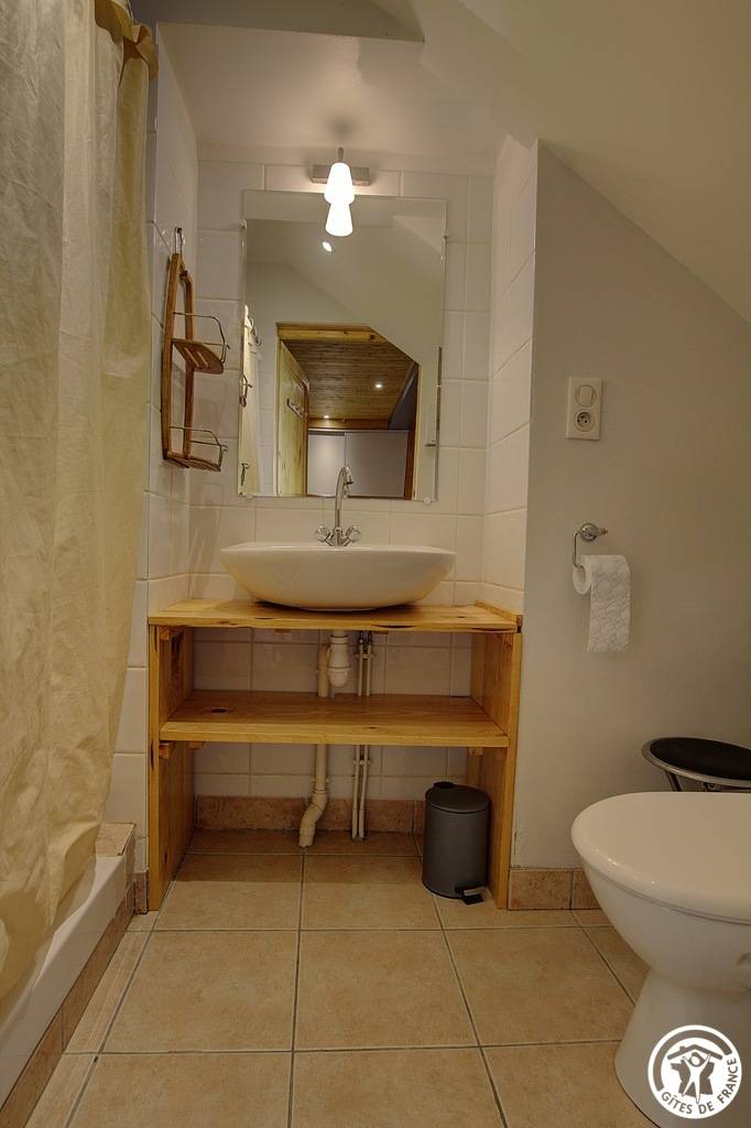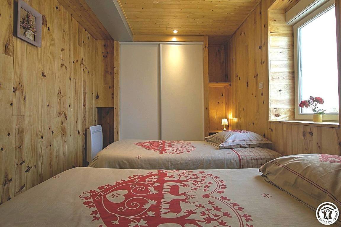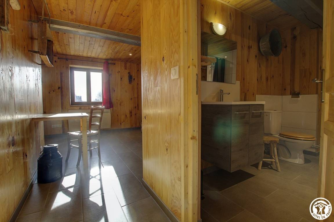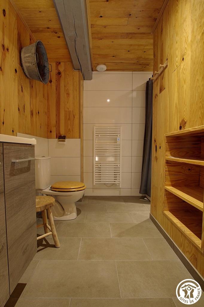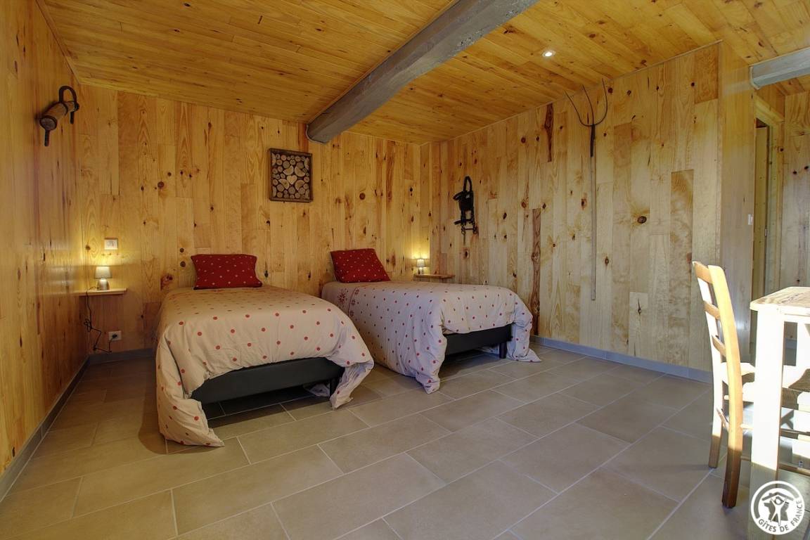 Entdecken Sie das Innere dieser Gîte: Über eine Stufe gelangen Sie zum Haupteingang, der in einen kleinen Flur führt. Von dort aus gelangen Sie in eine funktionale Küche mit einladender Sitzecke, ein komfortables Schlafzimmer mit zwei Einzelbetten (90 x 190 cm) und ein Badezimmer mit eigenem WC. Eine Holztreppe führt Sie nach oben, wo Sie ein großes Schlafzimmer mit zwei Einzelbetten (90 x 190 cm) und ein Badezimmer mit eigenem WC vorfinden. Bitte beachten Sie, dass die Heizung zusätzlich berechnet wird.