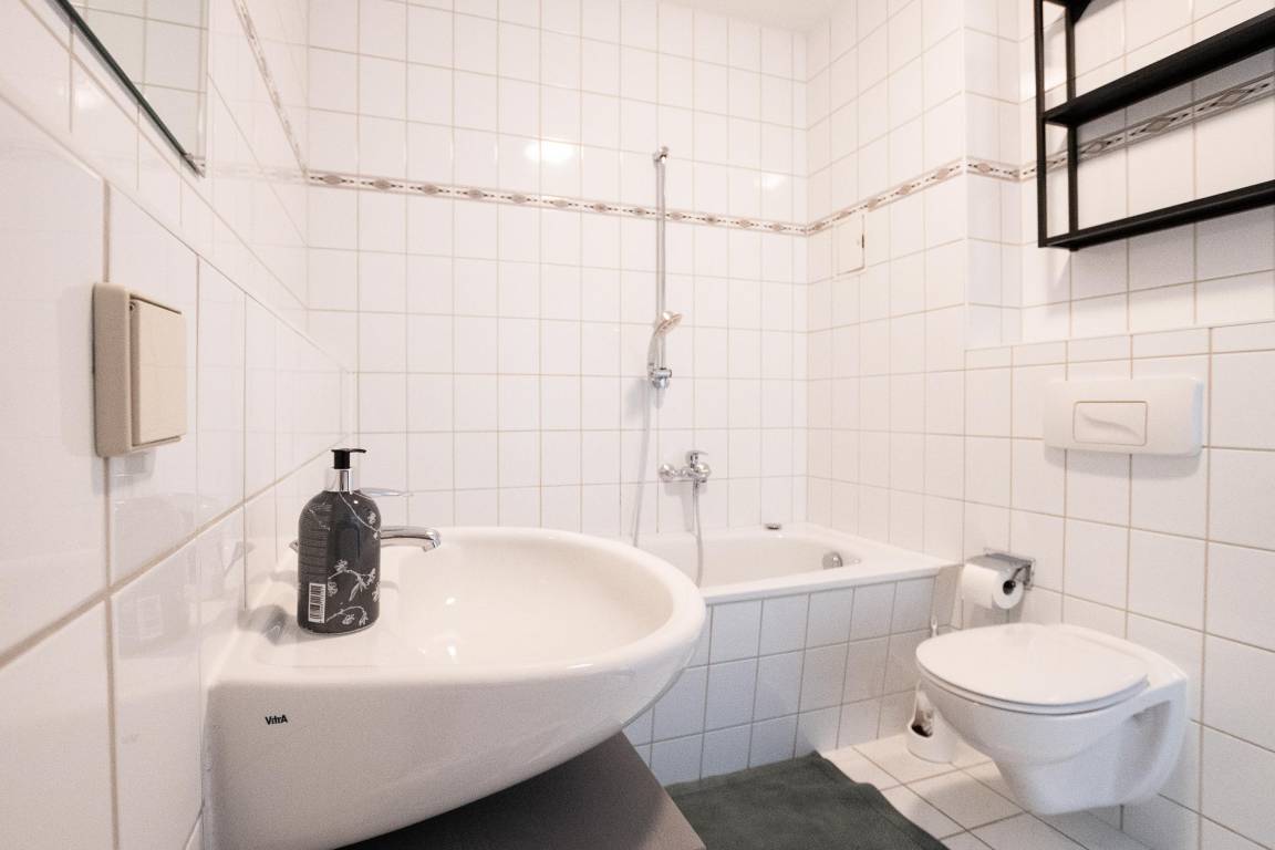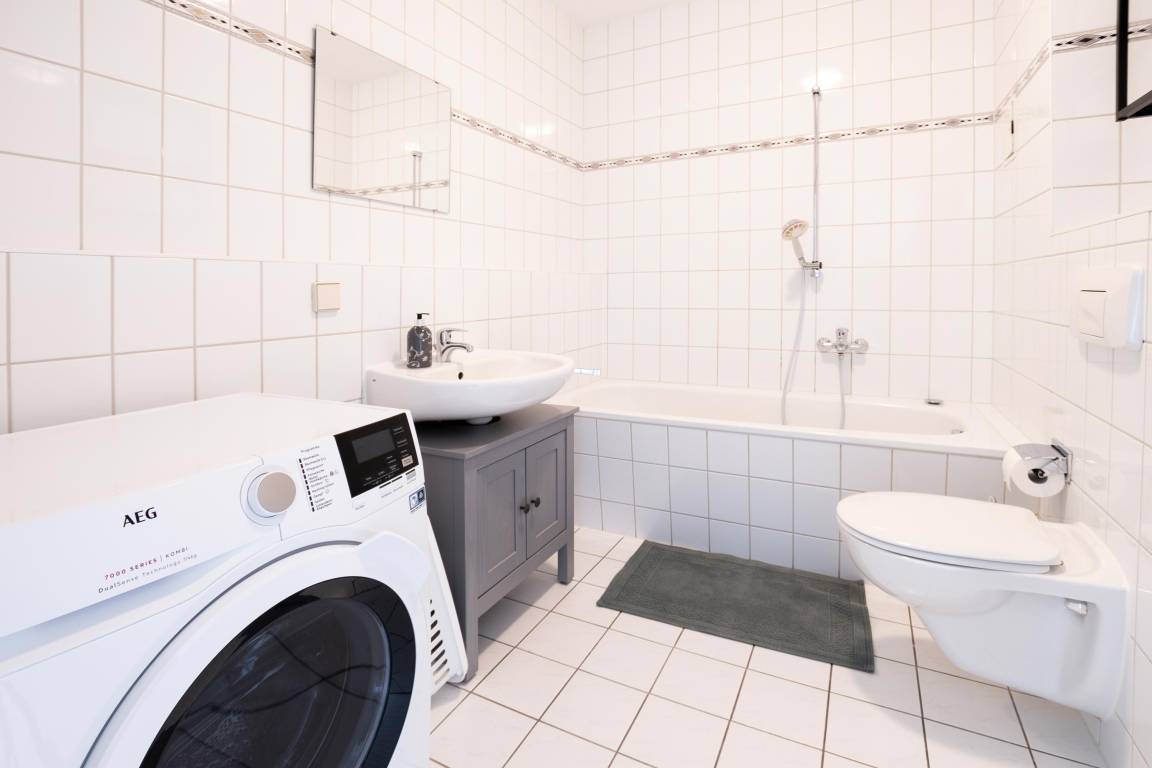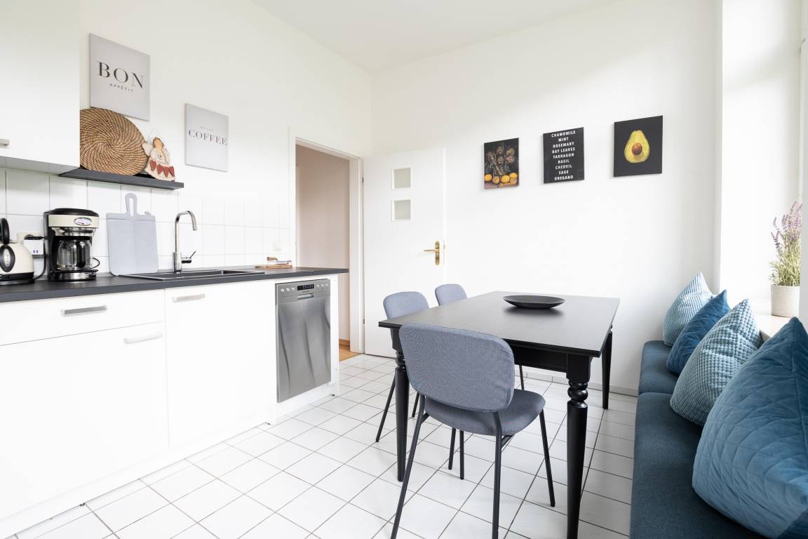 Die Ausstattung des Apartments umfasst ein gemütlichen Wohnzimmer mit offener Küche und einem großen Esstisch für gemütliche Abende, einen Flachbild-TV, sowie einen Internetzugang via WLAN. Die offene Wohnküche ist mit einer Kaffeemaschine (Filter), einer Mikrowelle, einem Toaster, einem Wasserkocher und einer Spülmaschine ausgestattet. Für längere Aufenthalte befinden sich auch ein Trockner und eine Waschmaschine in der Ferienunterkunft.