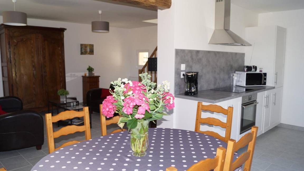 „Gîte propre et super équipé. On prend très vite ses marques dans ce gîte. L espace extérieur est un plus. Propriétaires très sympathiques et à l'écoute.“