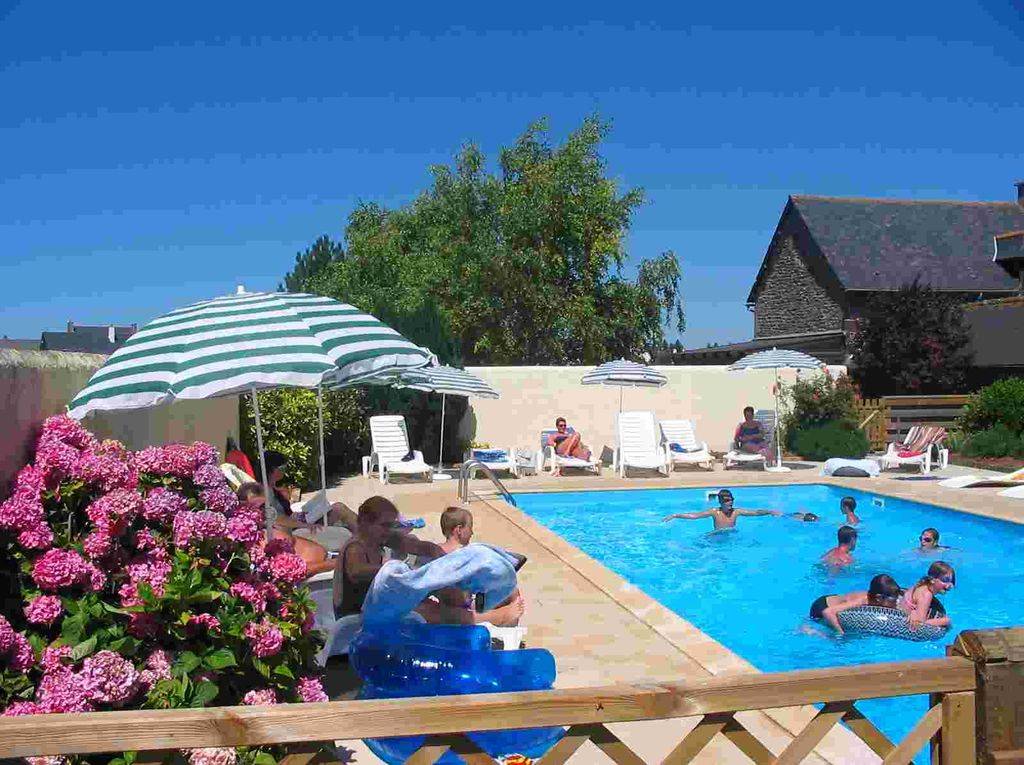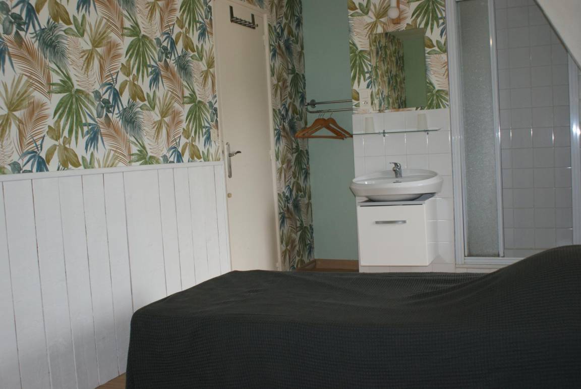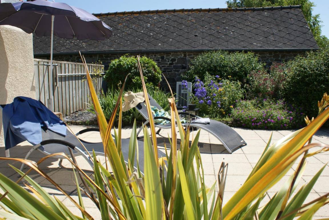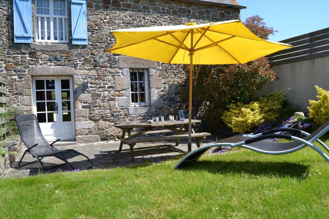 Ferienhaus Roazhon, anliegend an 2 andere Ferienhäuser: im EG: Einbauküche, Esszimmer-Wohnzimmer mit Kamin. Im Stockwerk: 1 Schlafzimmer mit 1 Doppelbett, 1 Schlafzimmer mit 1 Doppelbett, 1 Schlafzimmer mit 1 Doppelbett, 1 Schlafzimmer mit 2 Einzelbetten. Dusche und Waschbecken in jedem Schlafzimmer. WC. Elektrische Heizung. Eigener Hof mit Südausrichtung und Gartenmöbeln.