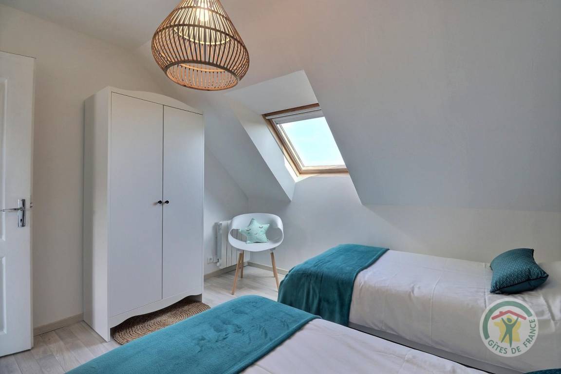 Im Obergeschoss: ein Schlafzimmer mit einem 160x200-Bett, ein Schlafzimmer mit zwei 90x190-Betten, ein Badezimmer mit WC.