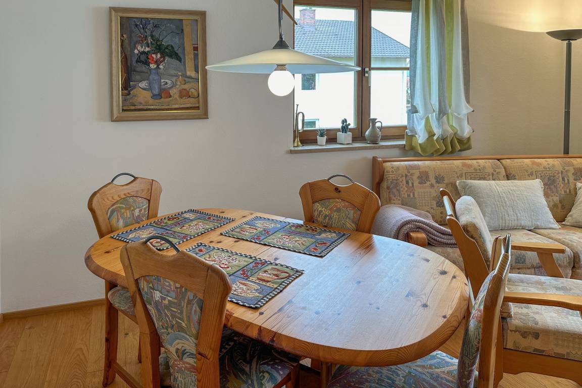 Helle Räume, viel Tageslicht und eine ruhige Lage am Ortsrand von Chieming machen die Ferienwohnung „Cäcilia" zu einem angenehmen Rückzugsort für bis zu 4 Personen. Auf 60 m² erwarten Sie ein separates Schlafzimmer, ein großzügiger Wohn- und Essbereich mit Schlafsofa sowie eine gut ausgestattete Küche.