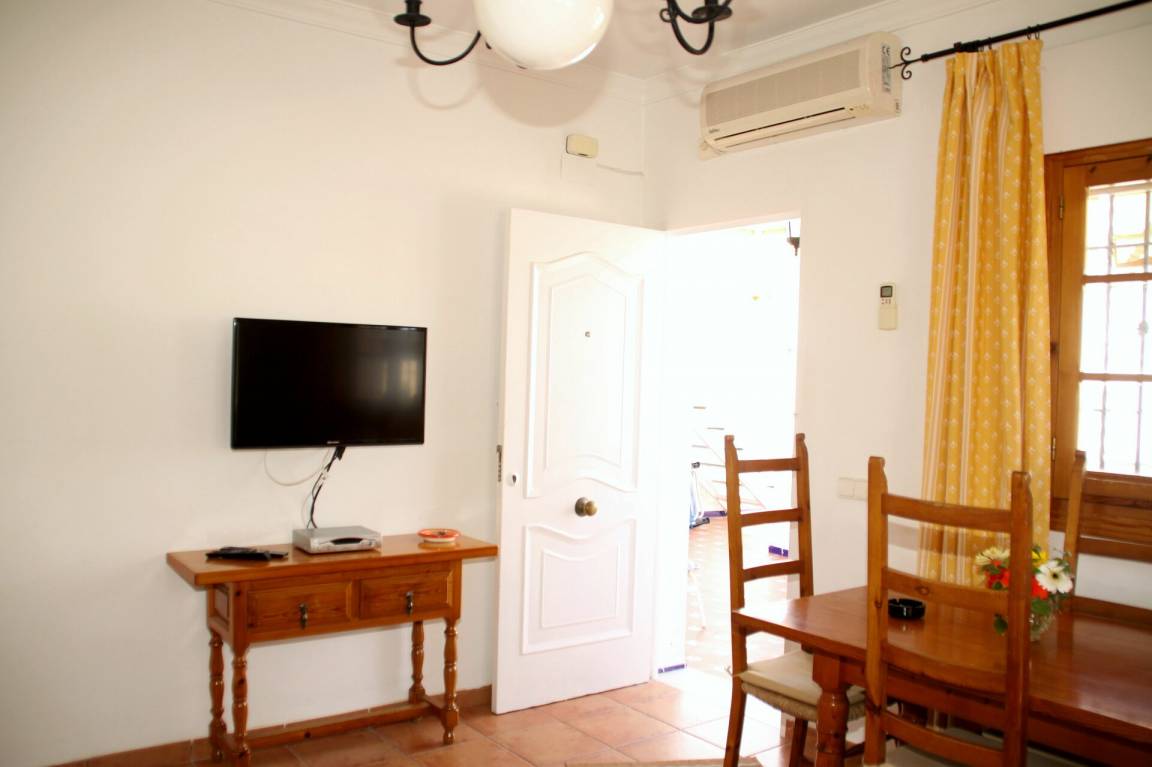 Wohnzimmer (13 m²): Sofa (Personen: 3), Sessel, Esstisch (Personen: 4), WiFi Internet, Klimaanlage, TV, Ausgang auf die Terrasse.
