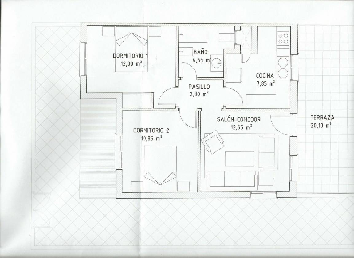 Mit Küche, Wohnzimmer, 2 Schlafzimmer, Badezimmer.