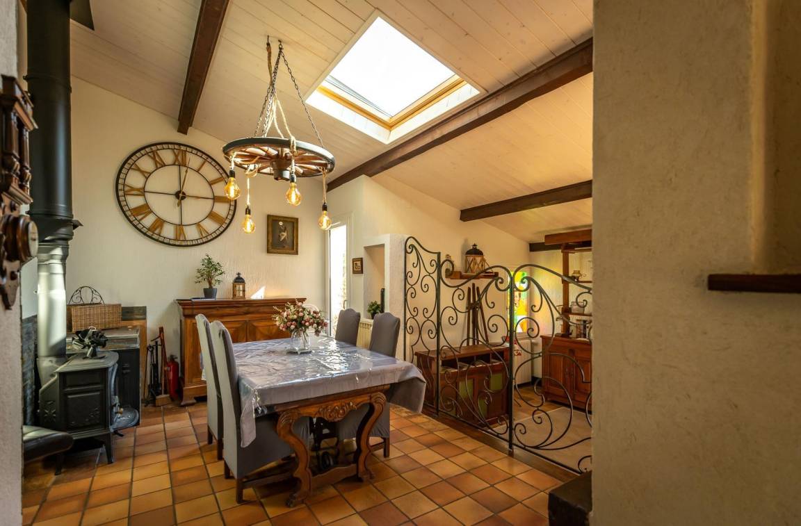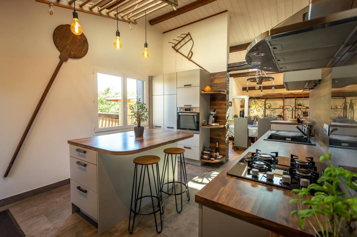Erdgeschoss: ausgestattete, zum Wohnzimmer offene Küche mit Holzofen. Das Wohnzimmer mit Bibliothek ist über 2 Stufen erreichbar.