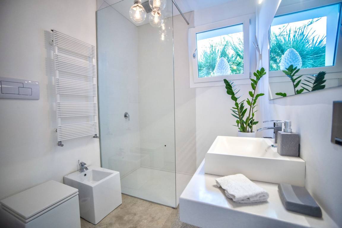 Badezimmer: Waschbecken, WC, Bidet, Dusche.