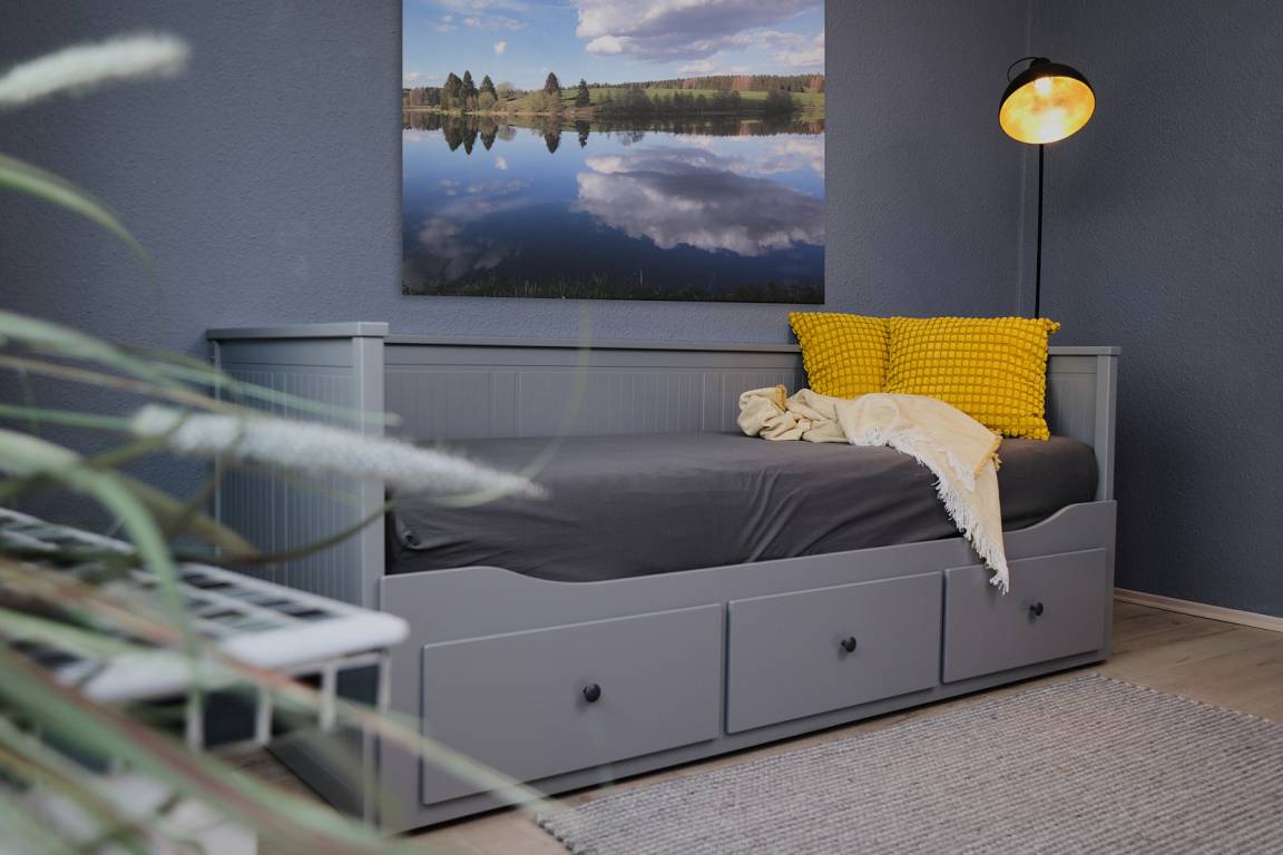 Willkommen in unserem grauen Zimmer – einem Verwandlungskünstler unter den Räumen! Das gemütliche Schlafsofa lässt sich mit wenigen Handgriffen in ein komfortables Doppelbett verwandeln und bietet zwei Personen – ob Kindern oder befreundeten Gästen – einen herrlich erholsamen Schlafplatz.