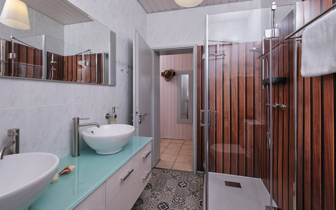 mit seinen zwei Waschbecken und der großzügigen Dusche bietet alles, was Sie brauchen, um erfrischt in den Tag zu starten oder entspannt in die Nacht zu gehen.