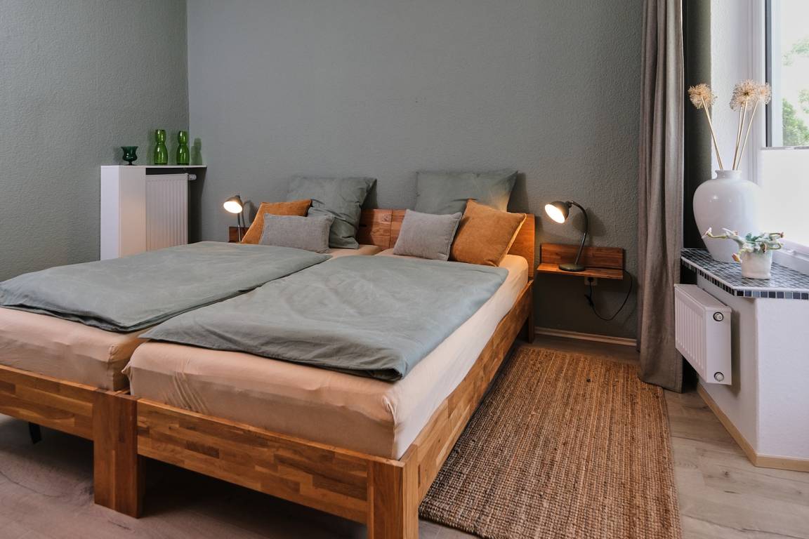 Im grünen Zimmer sorgen zwei großzügige Betten für erholsamen Schlaf und ein geräumiger Kleiderschrank bietet genug Platz für all Ihre Sachen – damit Sie sich ganz wie zu Hause fühlen.