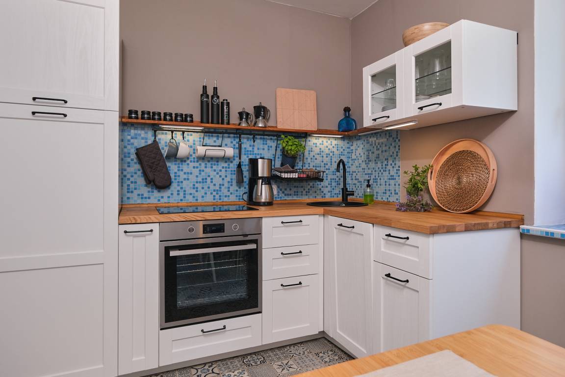 Die voll ausgestattete Küche bietet alles, was das kulinarische Herz begehrt – inklusive einer Grundausstattung an Ölen und Gewürzen. Ob gemeinsames Kochen oder ein romantisches Dinner zu zweit: Der Genuss beginnt hier schon bei der Zubereitung.