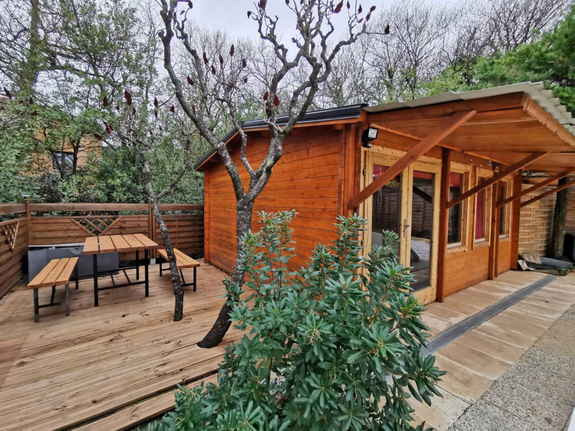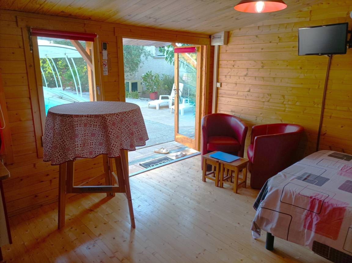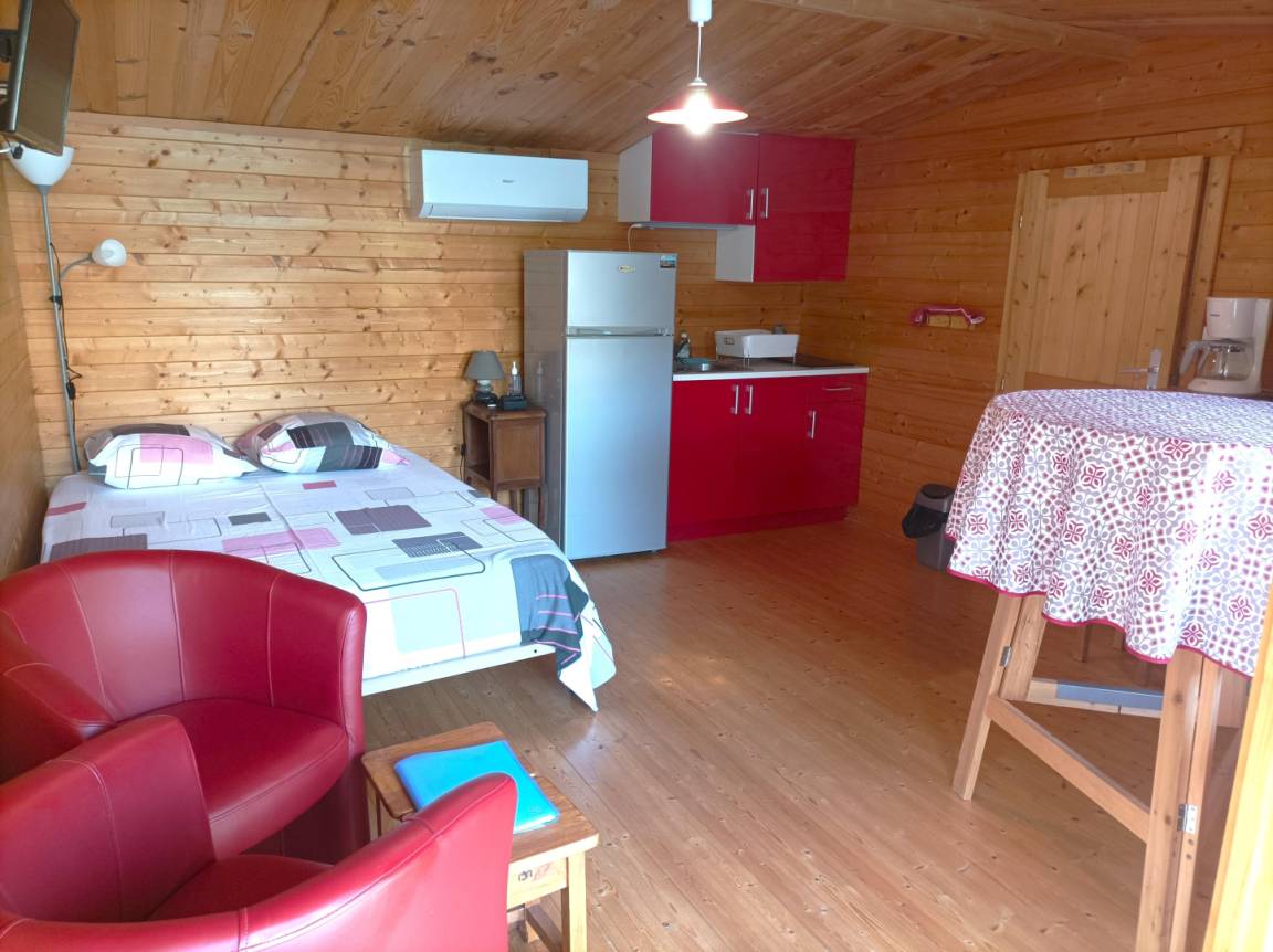 „Concept en bois situé à proximité d'un lotissement et d'aboiement d'un chien de voisin ce n'est pas le mieux si l'on ne profite pas de la région à visiter durant la journée. Le soir et le matin cela reste gênant. Le strict minimum en équipement ménager pour répondre sans doute aux critères de location mais pas très fonctionnel (premier prix pour les couverts par exemple), voire dangereux comme l'utilisation et le branchement de la bouilloire électrique. Pour un séjour en été la piscine est un plus, moins hors saison. A noter un très bon accueil du propriétaire et sa disponibilité durant la semaine passée.“