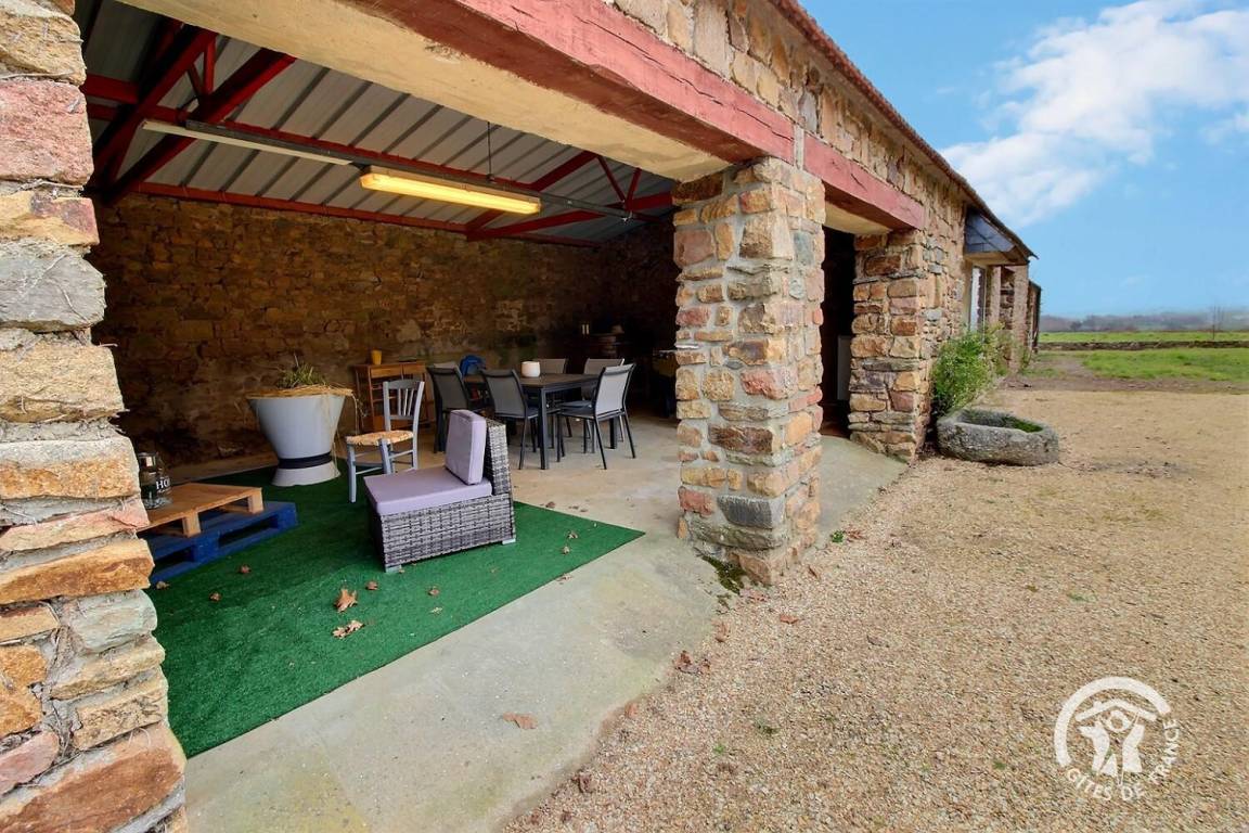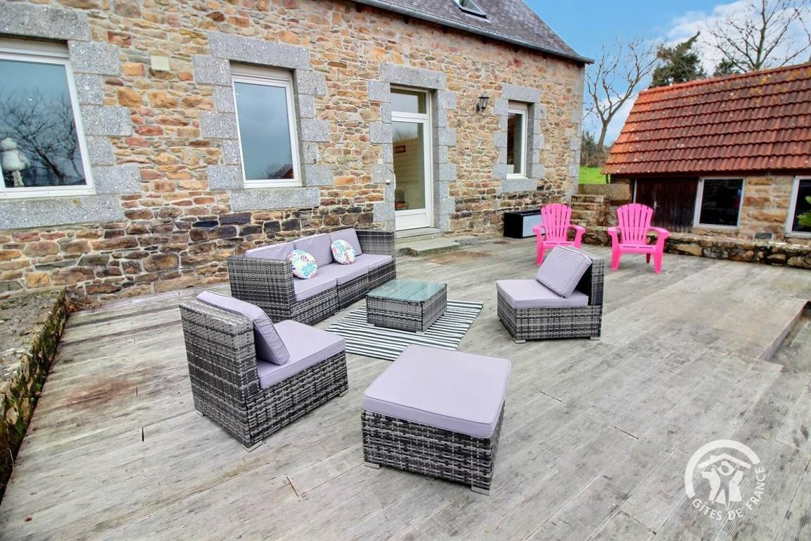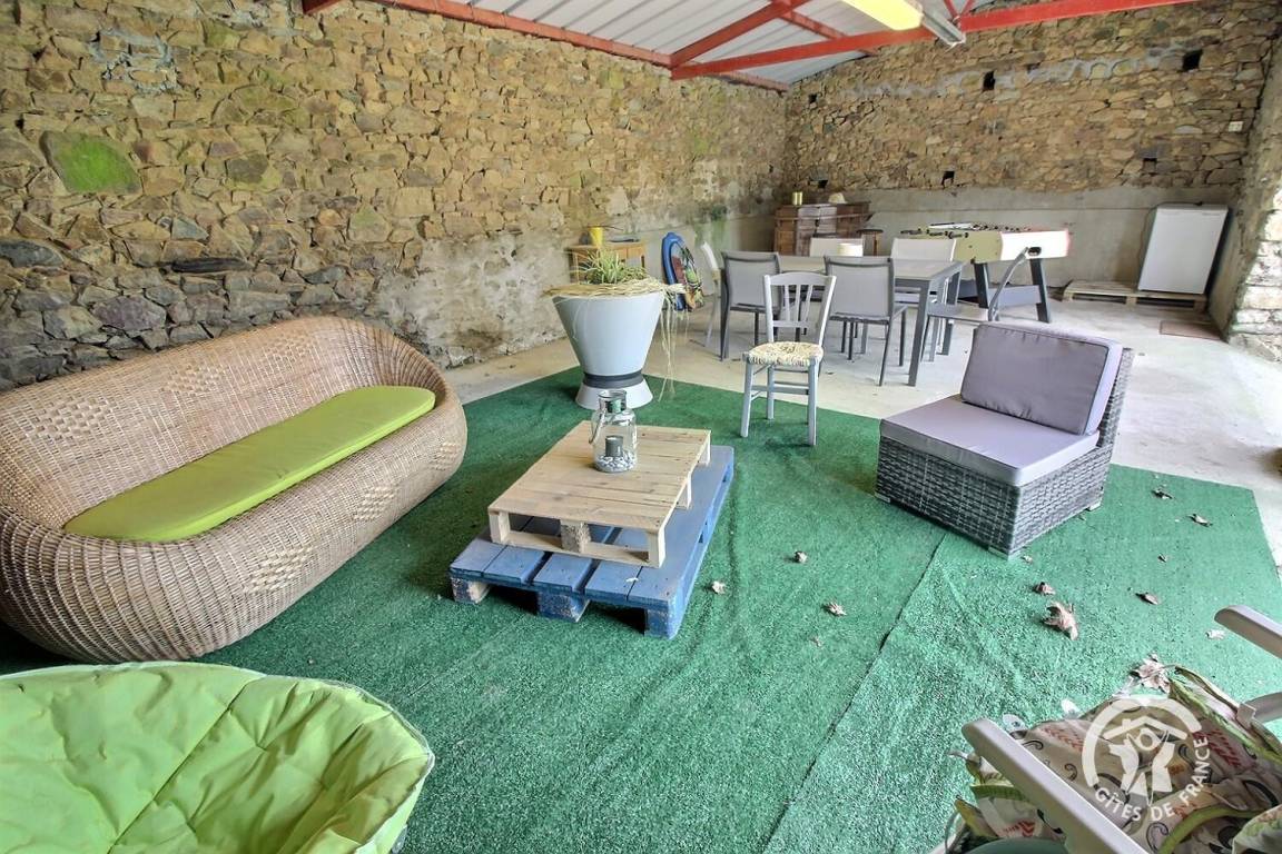 Das Haus bietet eine angenehme, nach Südosten ausgerichtete Terrasse mit Gartenmöbeln, auf der Sie entspannte Momente im Freien genießen können. Die Eigentümer haben die Nebengebäude dieses alten Bauernhofs in einen überdachten Raum mit Entspannungsbereich, Gartentisch und Tischfußball umgebaut, der sich perfekt für gesellige Momente mit der Familie oder Freunden eignet.
