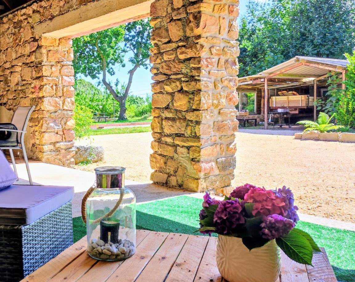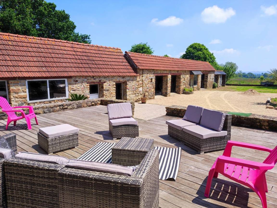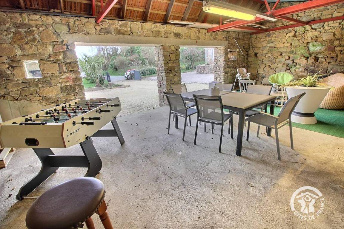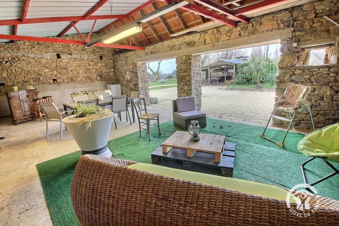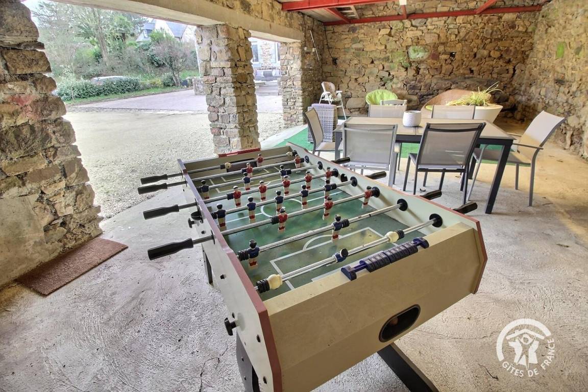 Ein umgebautes Nebengebäude mit Ruhebereich, Gartenmöbeln und Tischfußball