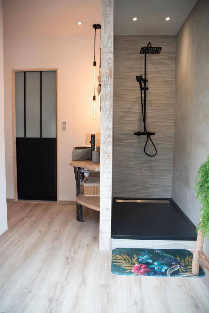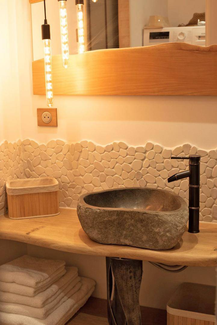 H das Badezimmer (mit geschlossenem WC), das vom Künstler DESIGN BY MITCH sorgfältig dekoriert wurde und über eine begehbare Dusche und ein Waschbecken verfügt. Im Obergeschoss führt der Gehweg zu den 2 Schlafzimmern. Je nach Jahreszeit genießen Sie zwei Terrassen mit Blick auf eine Wiese und die Puys-Kette. Ayurveda-Massage und Wellness auf Anfrage beim Eigentümer.