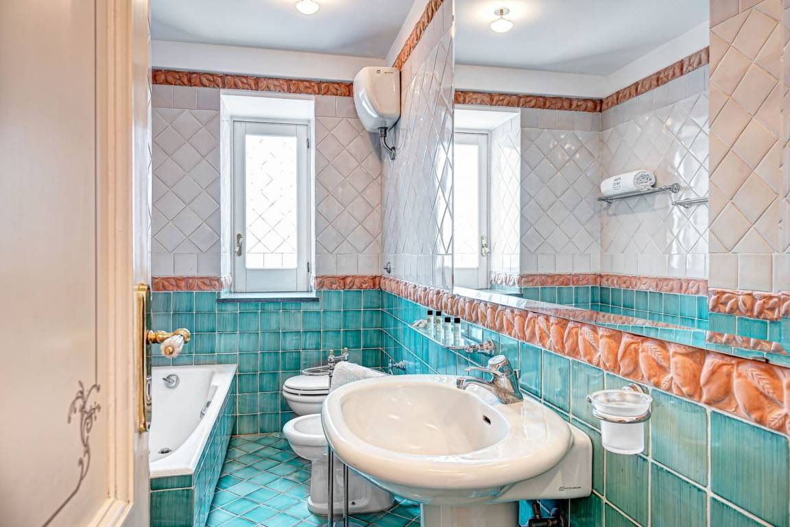 Schlafzimmer mit Bad 3: Doppelbett, WiFi Internet, Satelliten-TV, Waschbecken, WC, Bidet, Dusche, Fön.