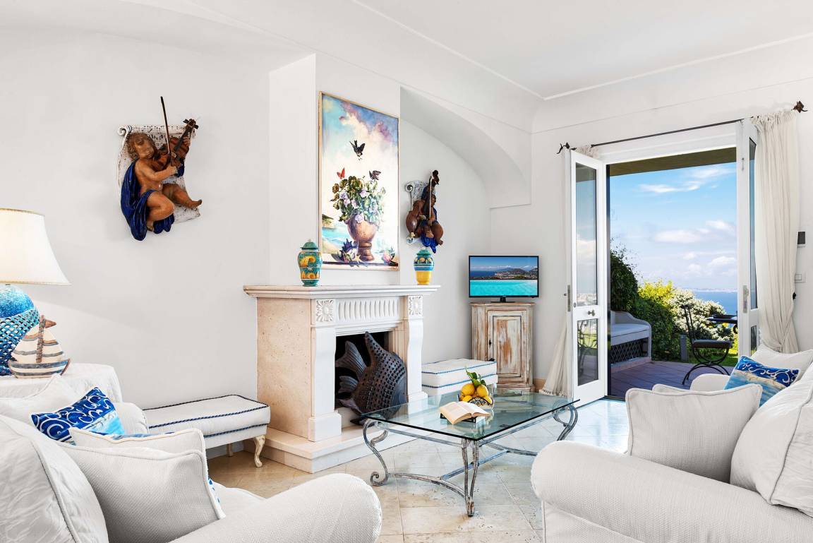 Wohnzimmer: Sofa, zwei Sessel, Esstisch, WiFi Internet, Klimaanlage, Satelliten-TV, Stereoanlage, Ausgang auf den Garten, Ausgang auf die Terrasse.