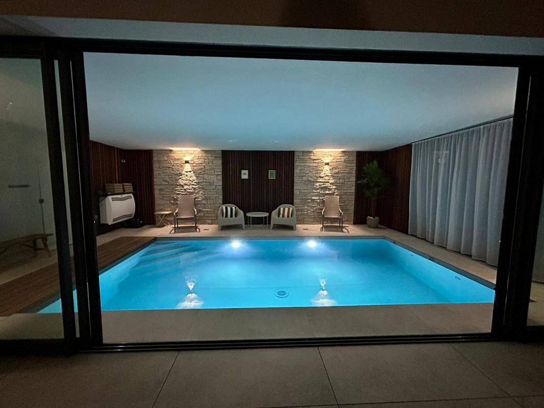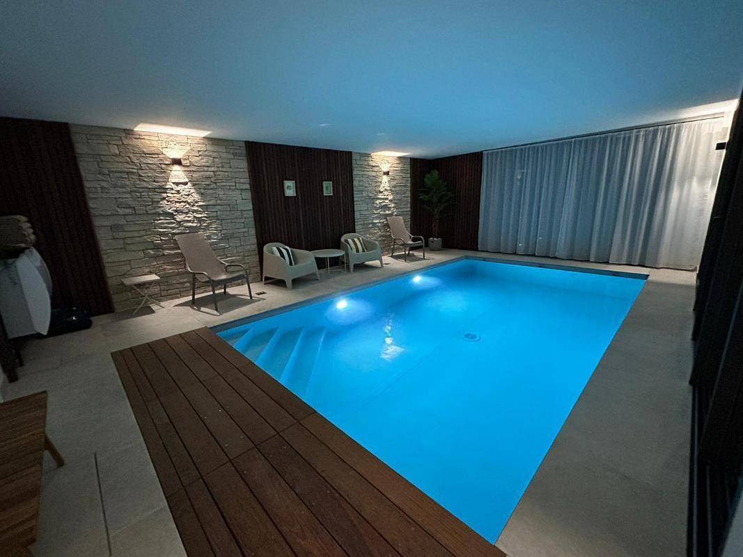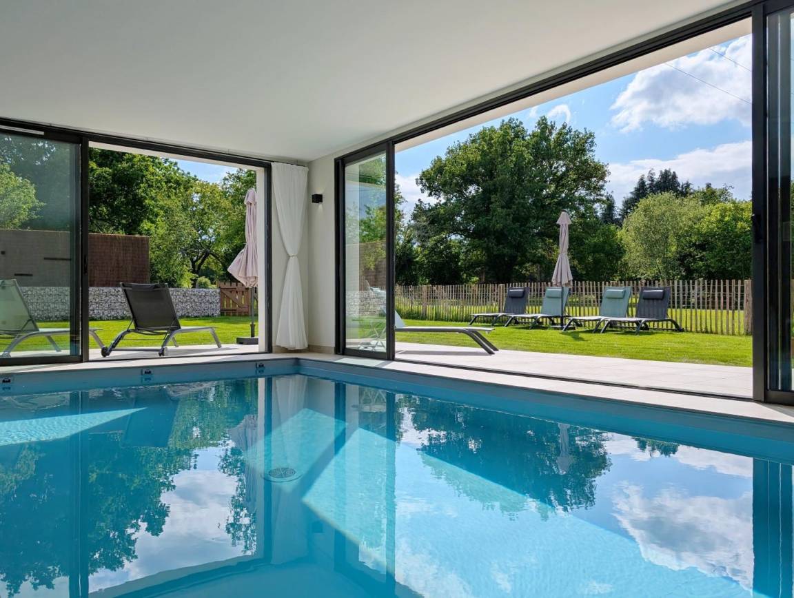 Das Highlight des Hauses: das herrliche beheizte Hallenbad. Dank der großen Schiebefenster öffnet es sich weit zur möblierten Terrasse und zum umzäunten Garten, sodass Sie die Natur in vollen Zügen genießen können.