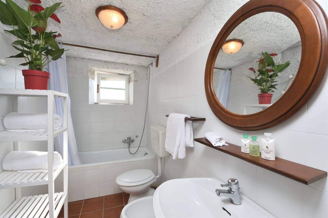Badezimmer: Waschbecken, WC, Bidet, Badewanne, Dusche.