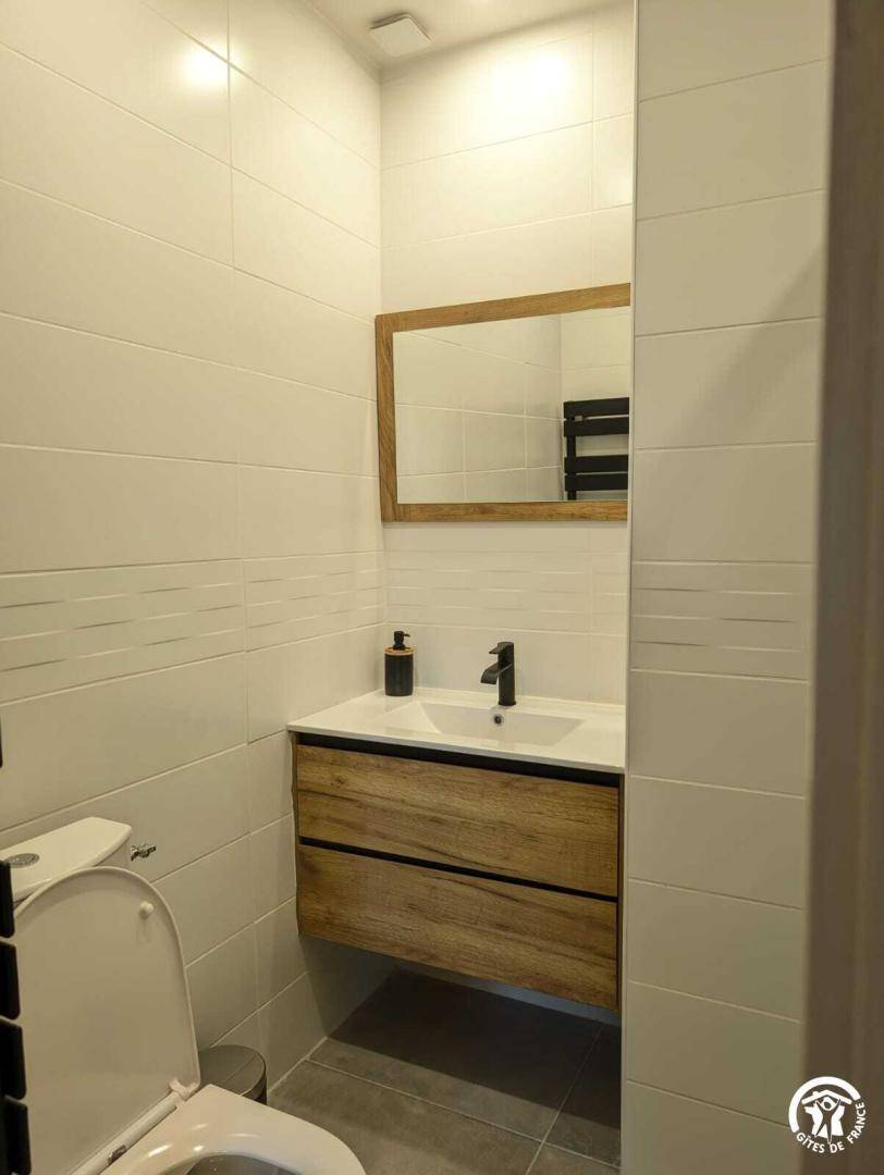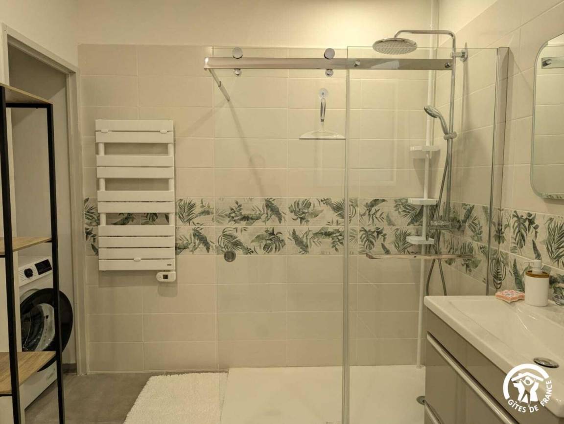 Ein zusätzliches Badezimmer mit Dusche und Waschbecken sowie ein separates WC und eine Waschmaschine vervollständigen die Unterkunft.