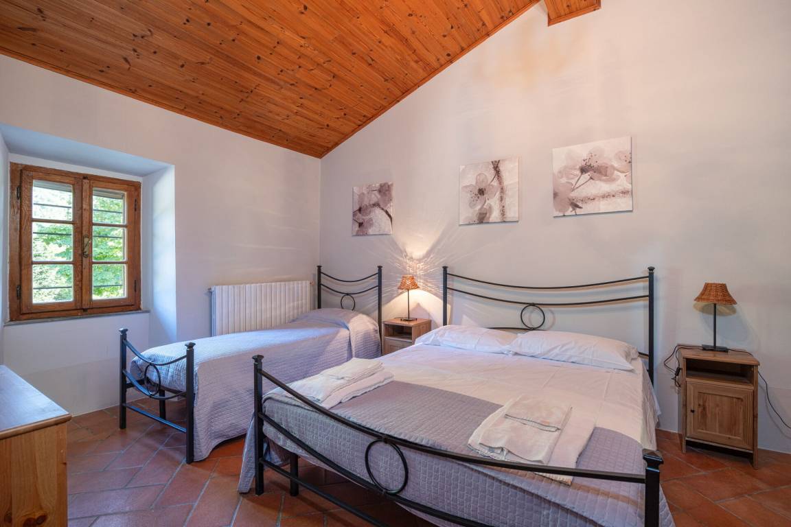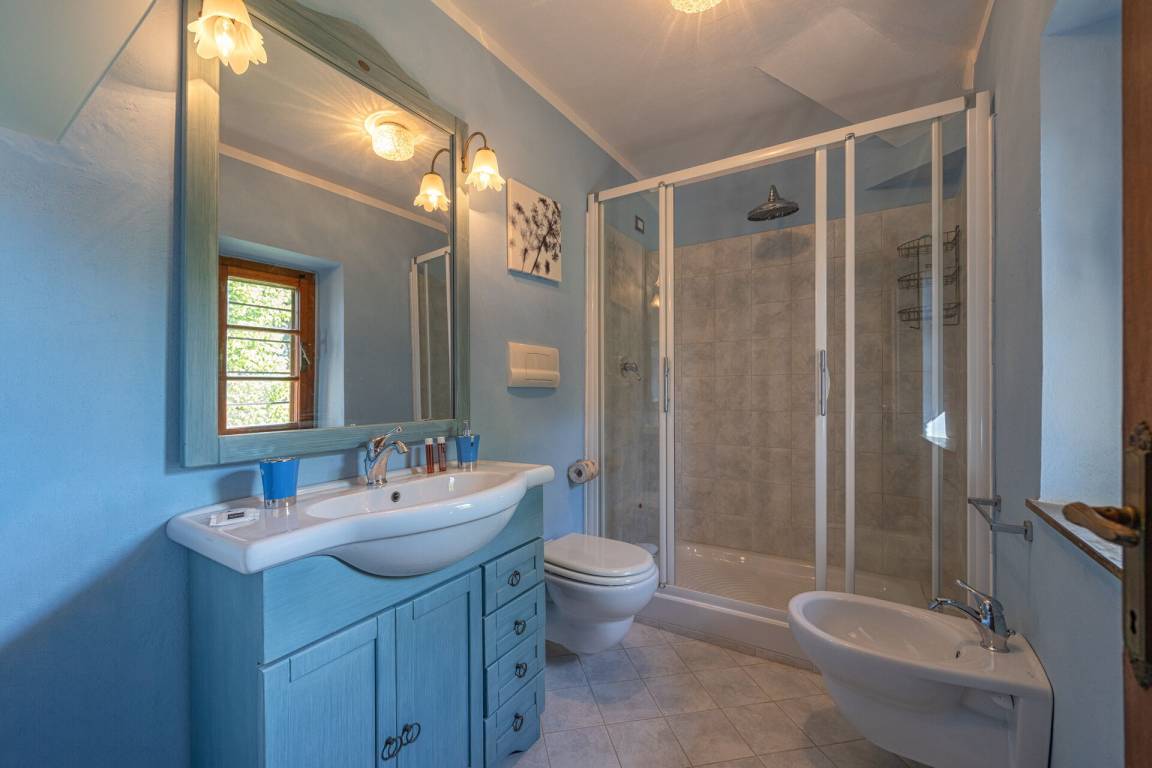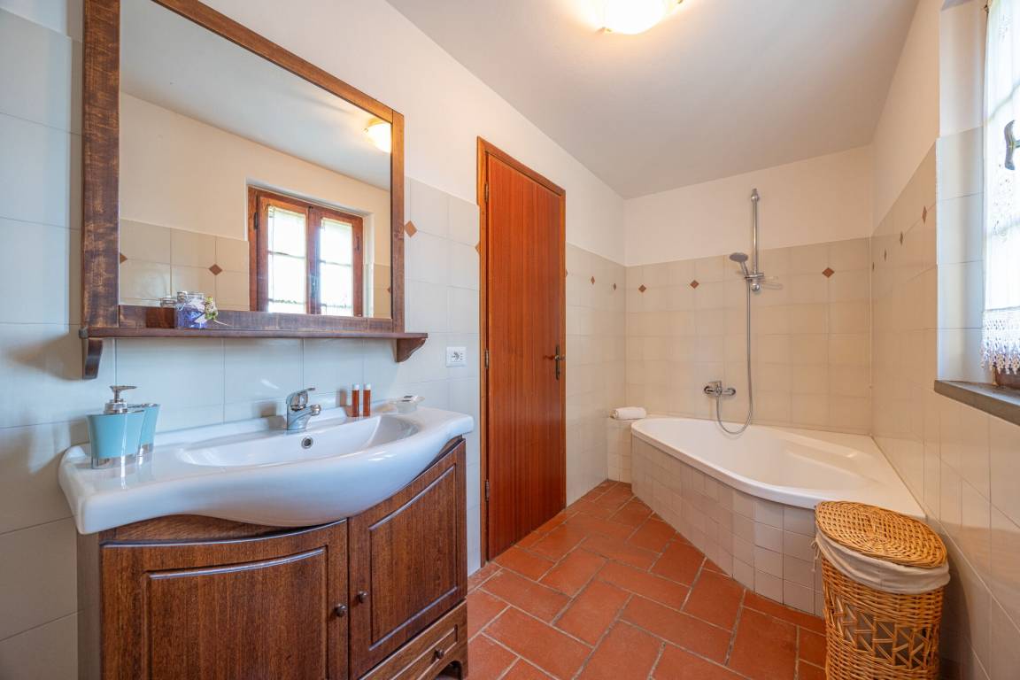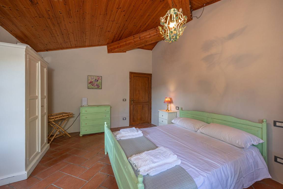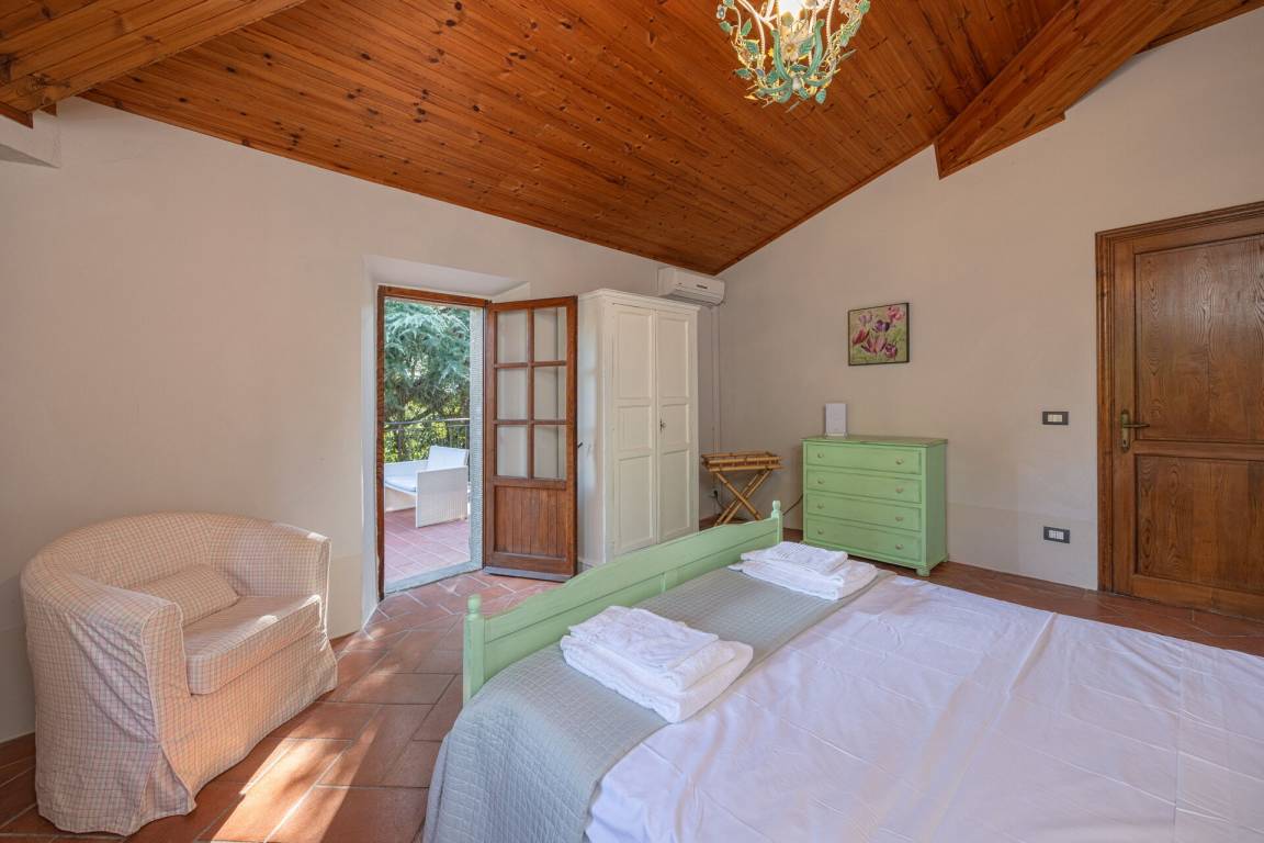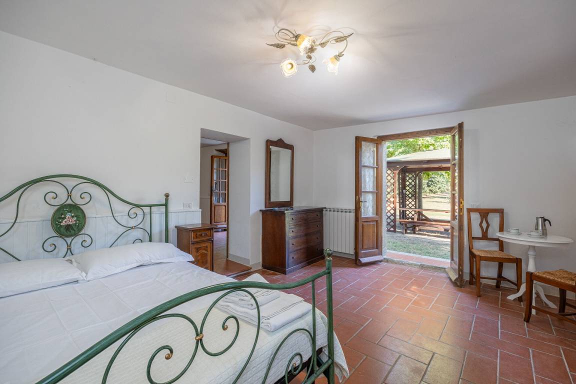 Schlafzimmer mit Bad: Doppelbett, WiFi Internet, Sofa, Sessel, Waschbecken, WC, Bidet, Badewanne, Fön, Ausgang auf den Garten.