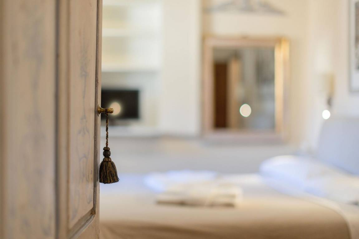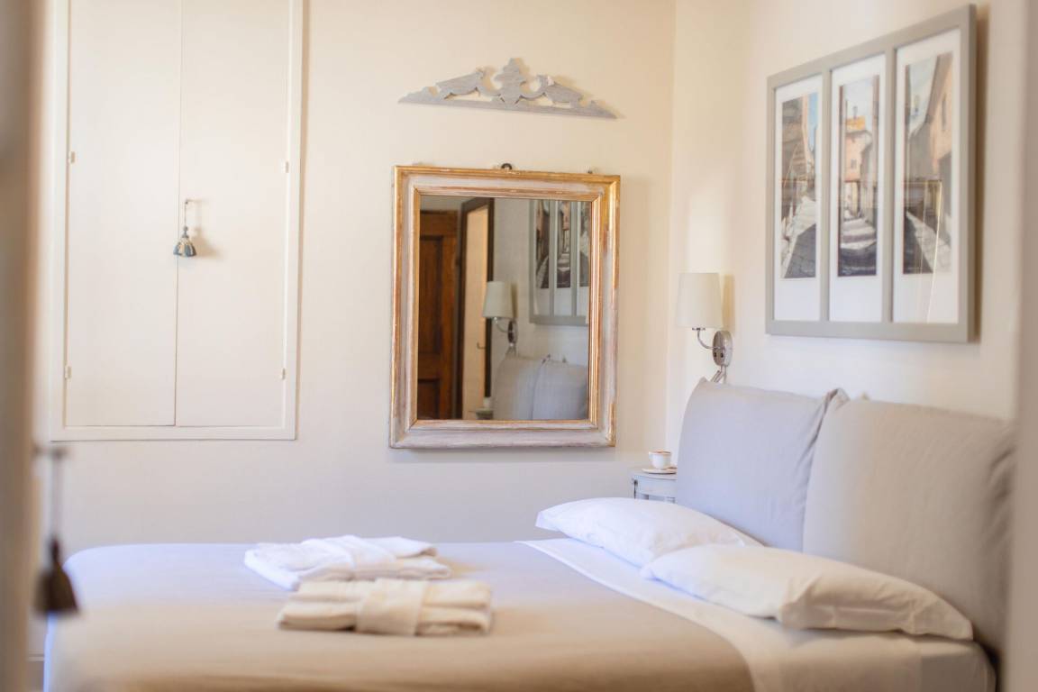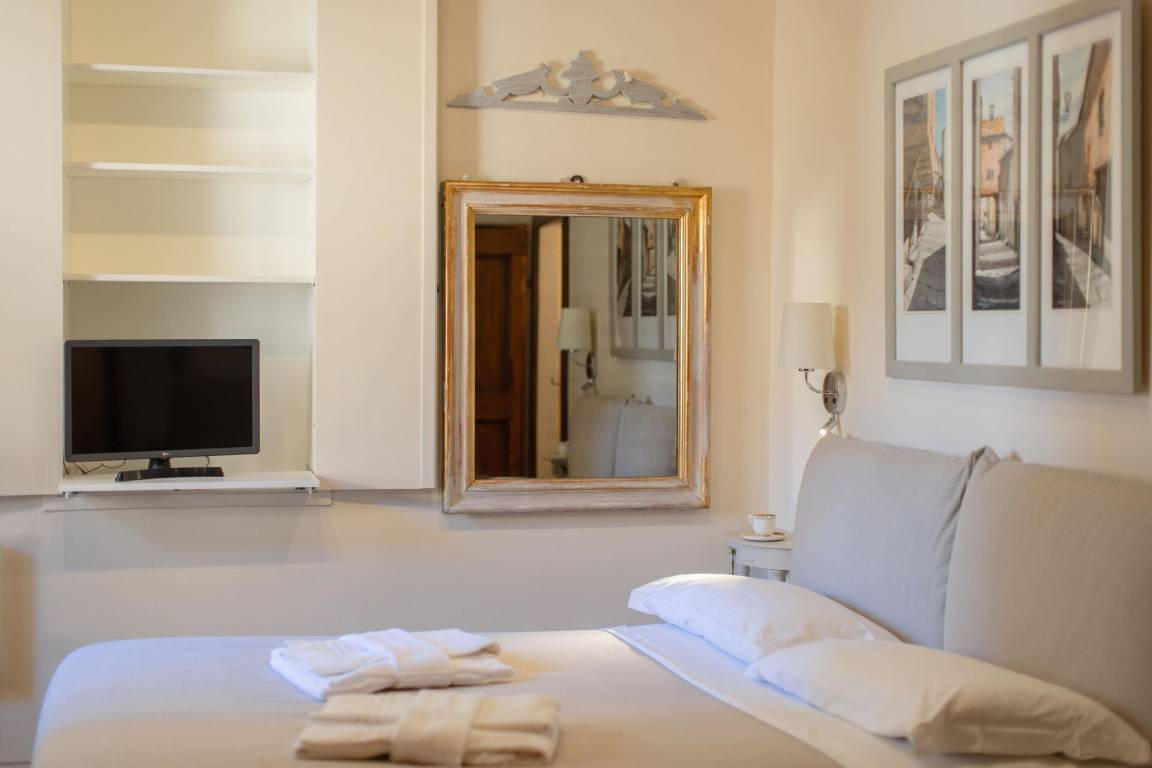 Schlafzimmer mit Bad: Doppelbett (Breite: 170m, Länge: 200m), WiFi Internet, Klimaanlage, TV, Sessel, Waschbecken, WC, Bidet, Dusche, Fön, Badezimmer ohne Fenster.
