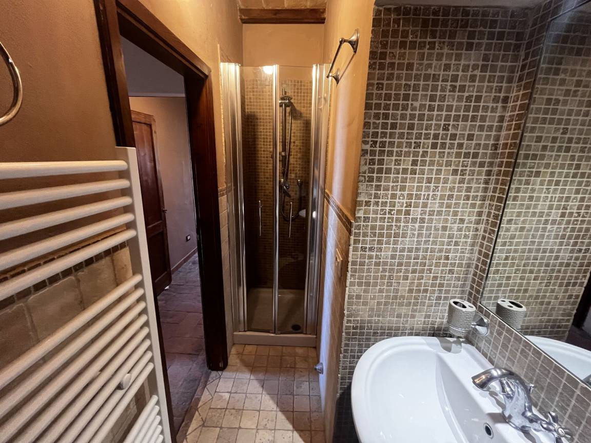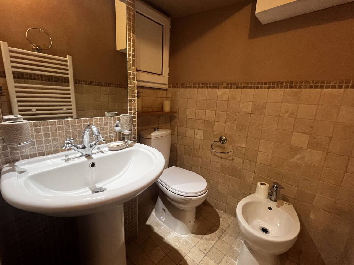 Badezimmer: Waschbecken, WC, Bidet, Dusche.