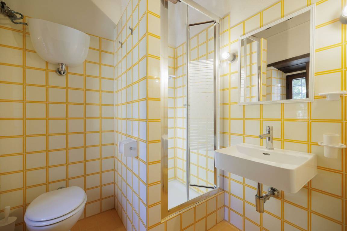 Badezimmer: Waschbecken, WC, Bidet, Dusche, Fön, Fliegengitter.
