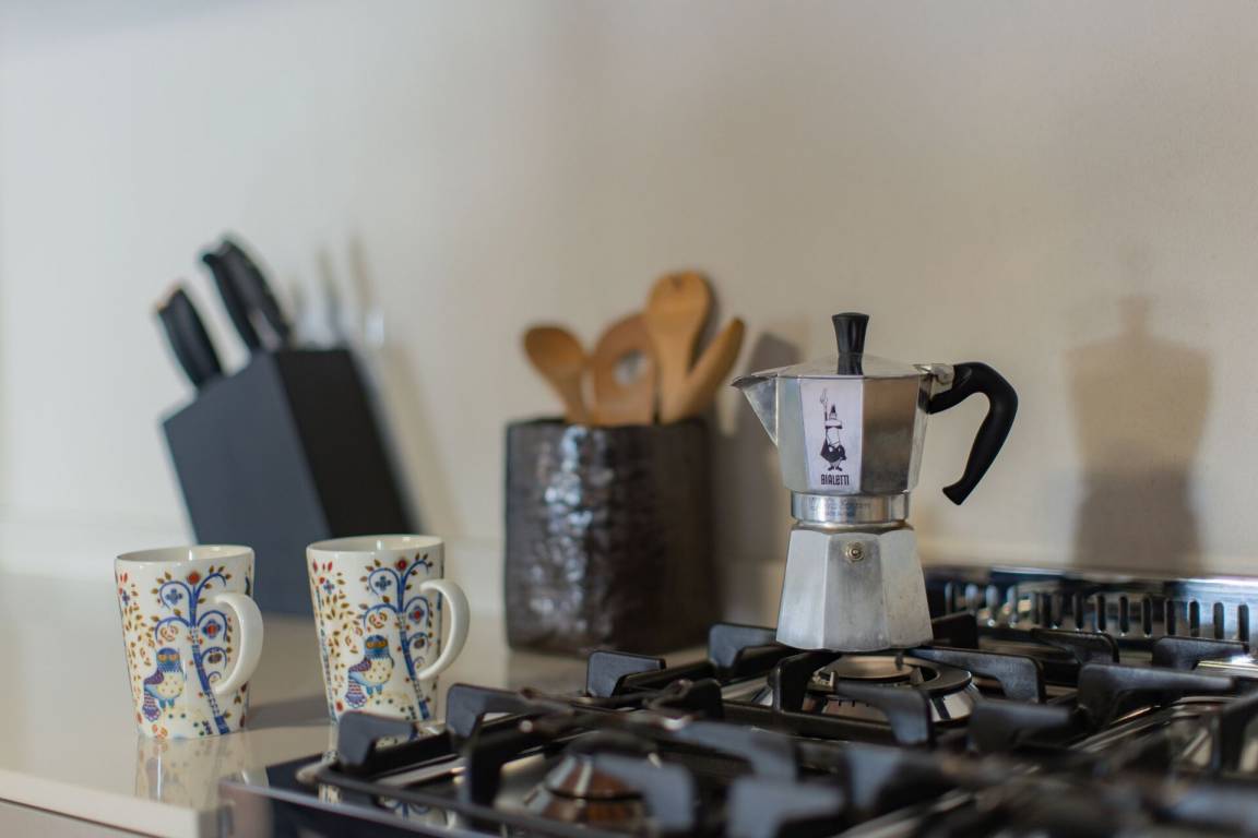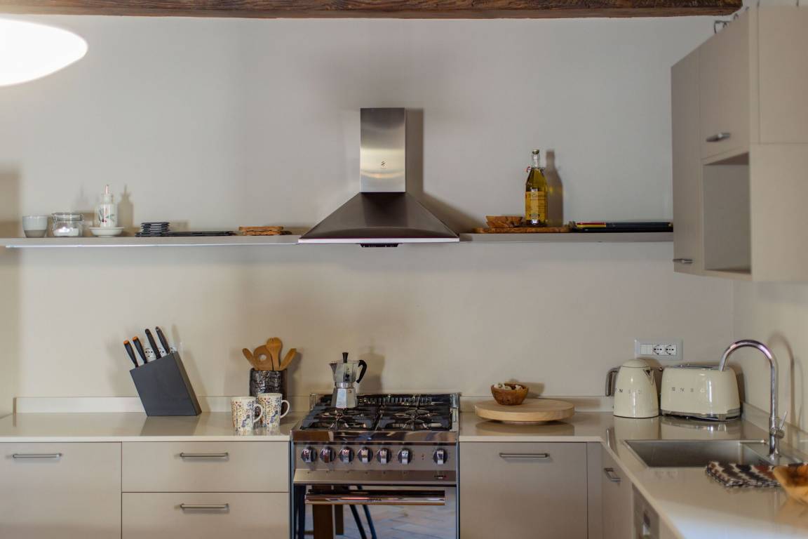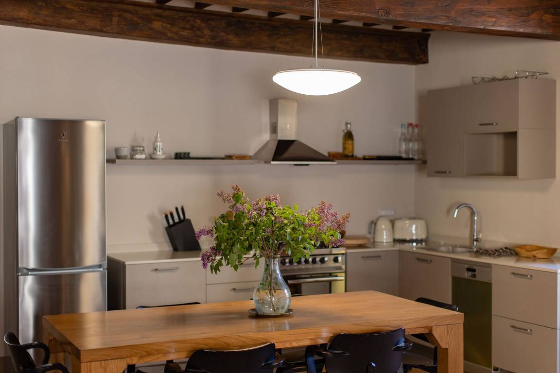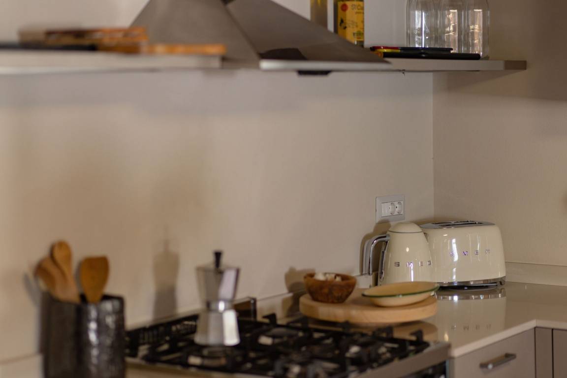 offener Raum: drei Sessel, Esstisch, zwei Sofa bed, WiFi Internet, Satelliten-TV, Deckenventilator, Kühlschrank, Herd, Waschmaschine, Tiefkühler, Spülmaschine, Bügeleisen, gut ausgestattete Küche, Ofen, Toaster, Italienische Kaffeemaschine.