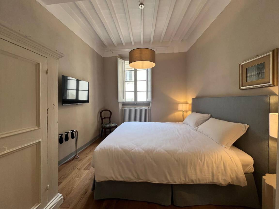 Schlafzimmer mit Bad: Doppelbett, WiFi Internet, Klimaanlage, Satelliten-TV, Waschbecken, WC, Dusche, Fön.