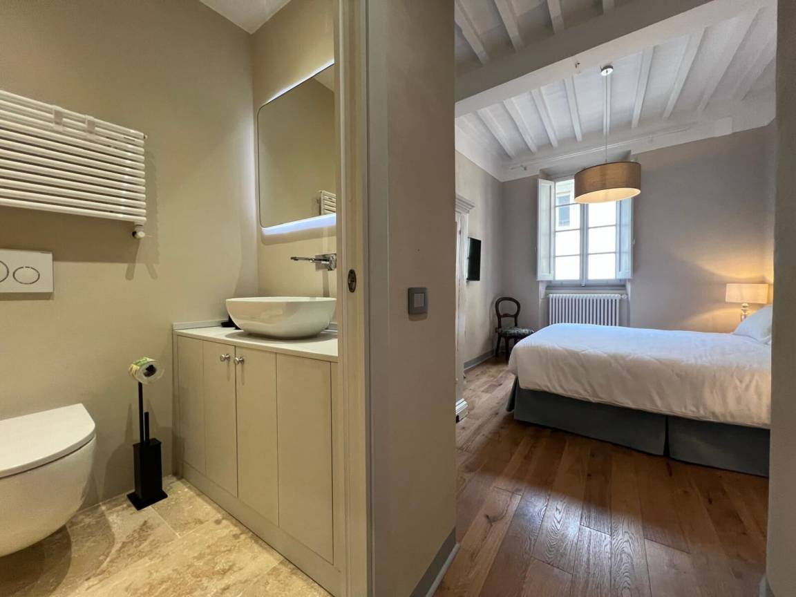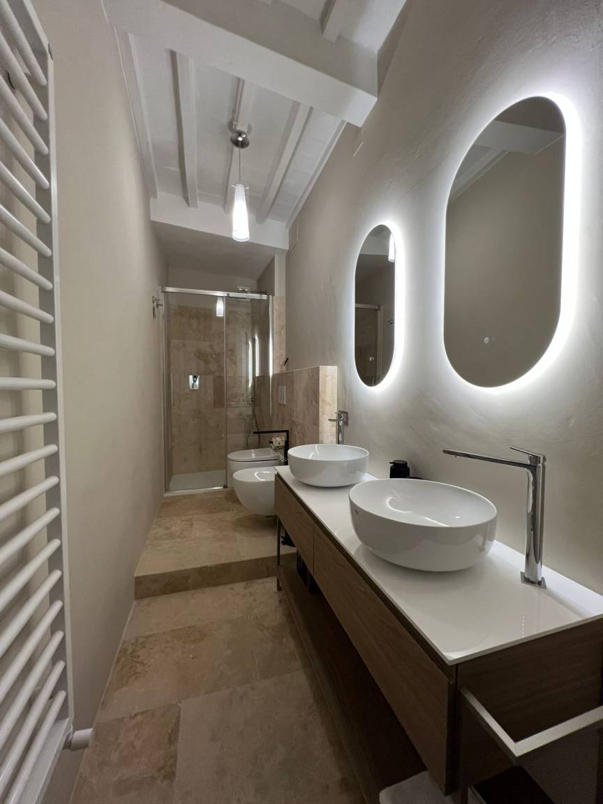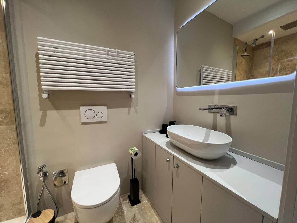 Badezimmer: Doppelwaschbecken, WC, Bidet, Dusche, Fön, WiFi Internet.
