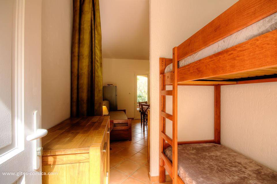 - Wohnzimmer/Küche mit Schlafbereich mit 2 Etagenbetten 90x190 cm (das obere Bett ist nicht für Kinder unter 6 Jahren geeignet) und 1 Sitzbank mit Ausziehbett 80x190cm.
