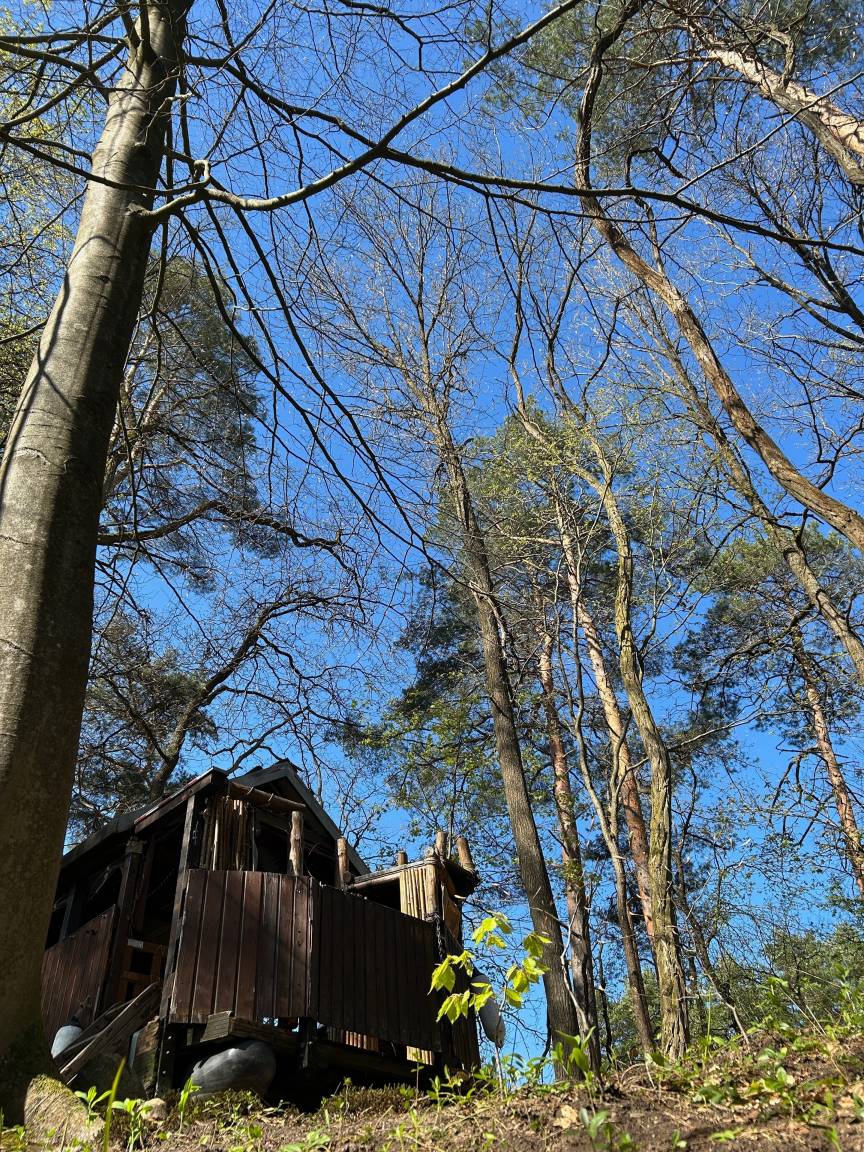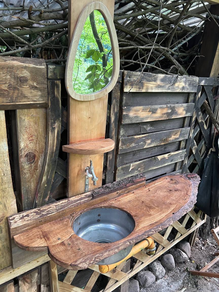 - Es gibt ein Freiluft-Sanitärhäuschen mit Dusche, Einbau-Trockentoilette, Herrenpissoir und Handwaschbecken mit Anrichte (multifunktional als Außenküche oder Frisiertoilette)